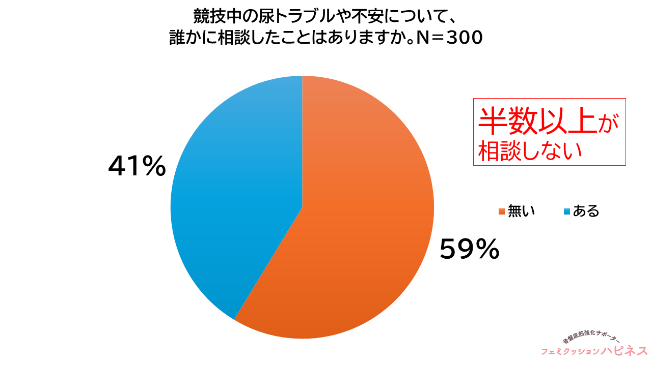 競技中の尿トラブルや不安について「相談したことがない」と回答した人は58.7%(176人)でした。