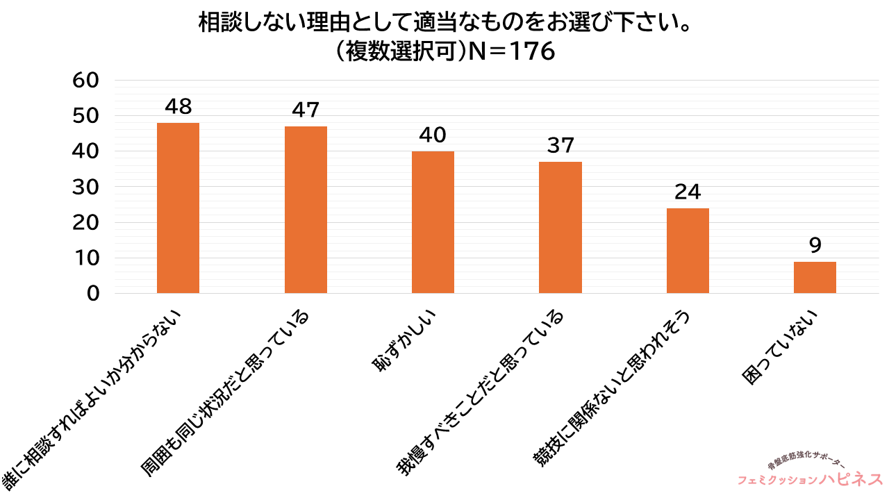 相談しない理由(176人中、複数回答)としては、「誰に相談すればよいか分からない」が27.3%(48人)、「周囲も同じ状況だと思っている」が26.7%(47人)、「恥ずかしい」が22.7%(40人)、「我慢すべきことだと思っている」が21.0%(37人)、「競技に関係ないと思われそう」が13.6%(24人)でした。