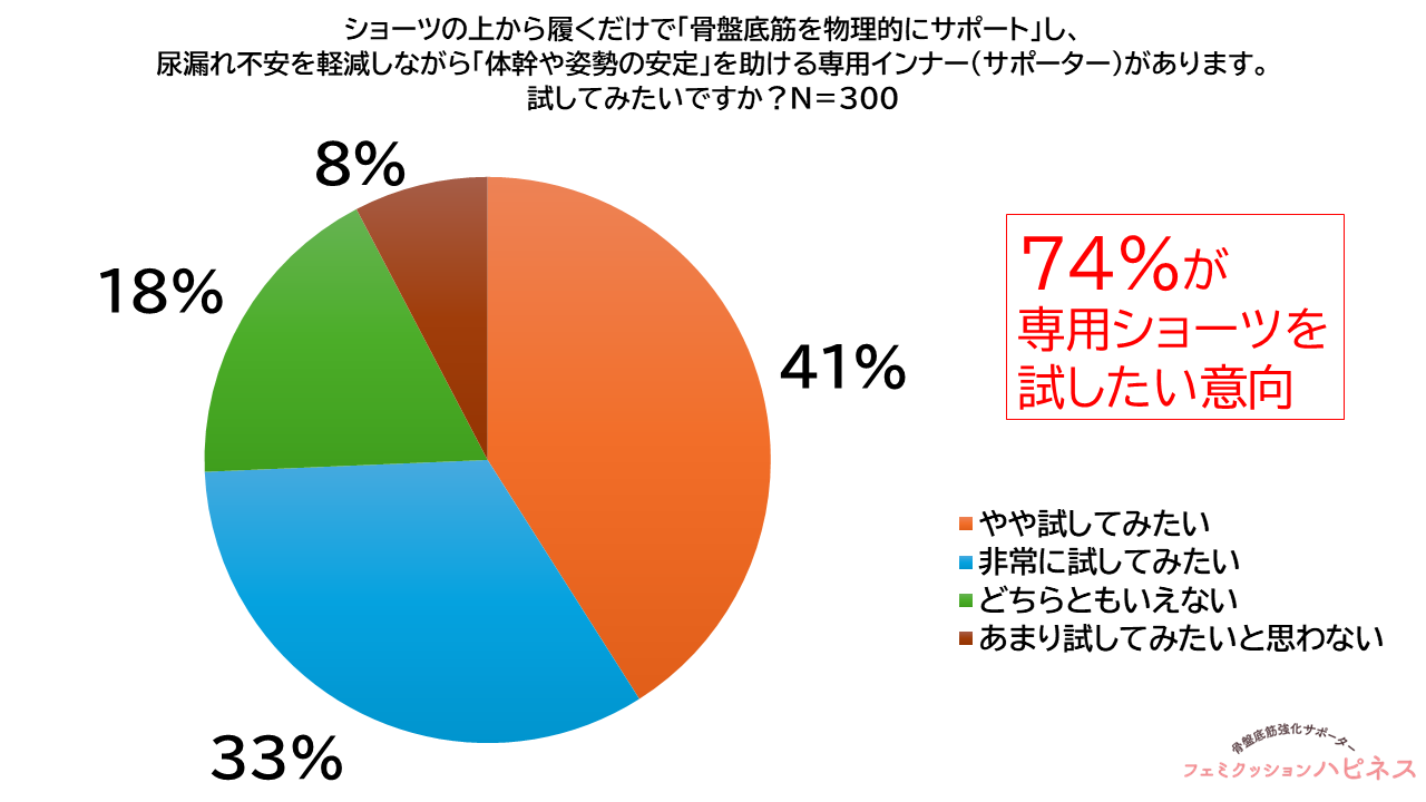 また、ショーツの上から着用し骨盤底筋を物理的にサポートする専用インナーについては、「非常に試してみたい」が33.3%(100人)、「やや試してみたい」が41.0%(123人)で、合計74.3%(223人)が関心を示しました。