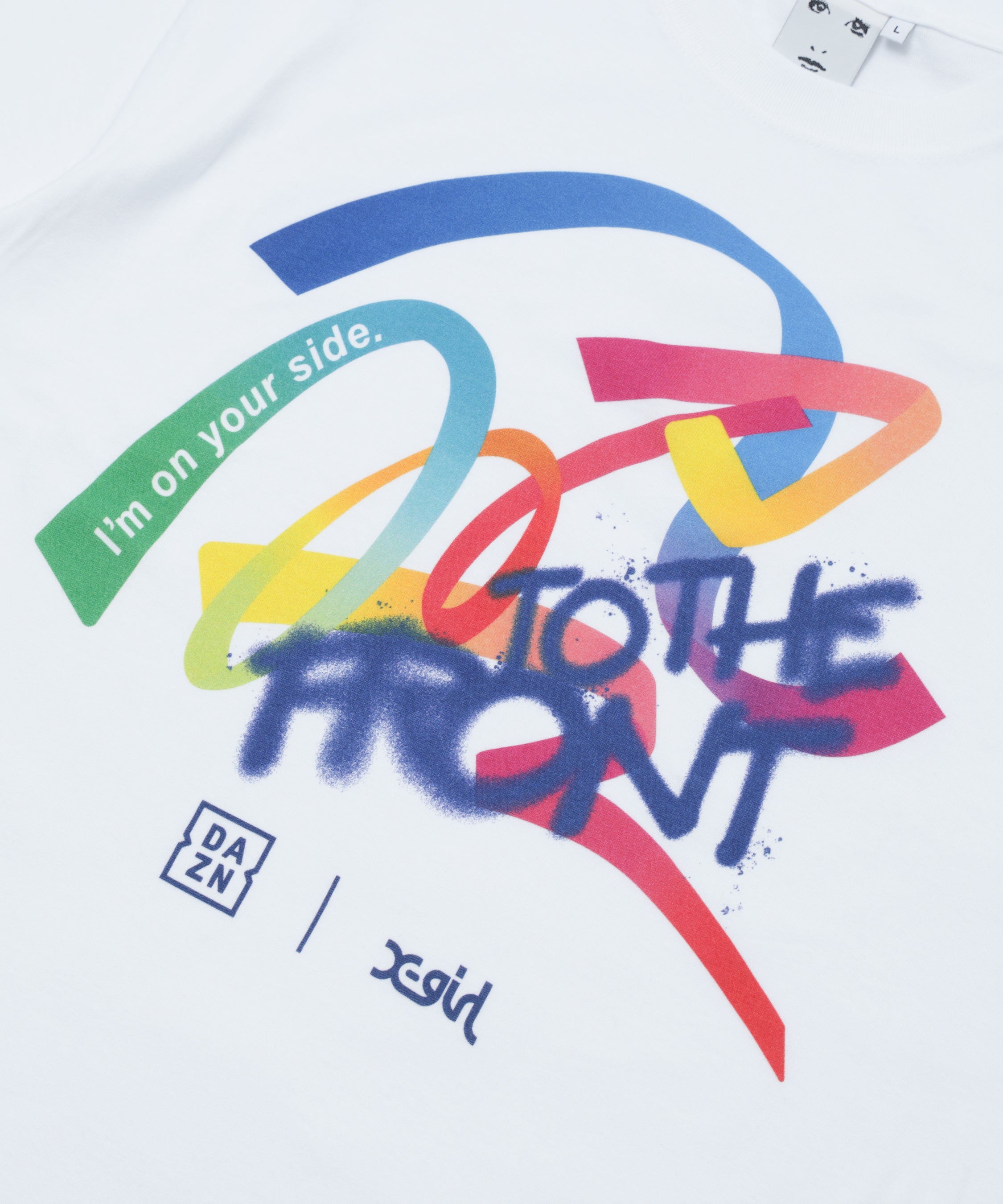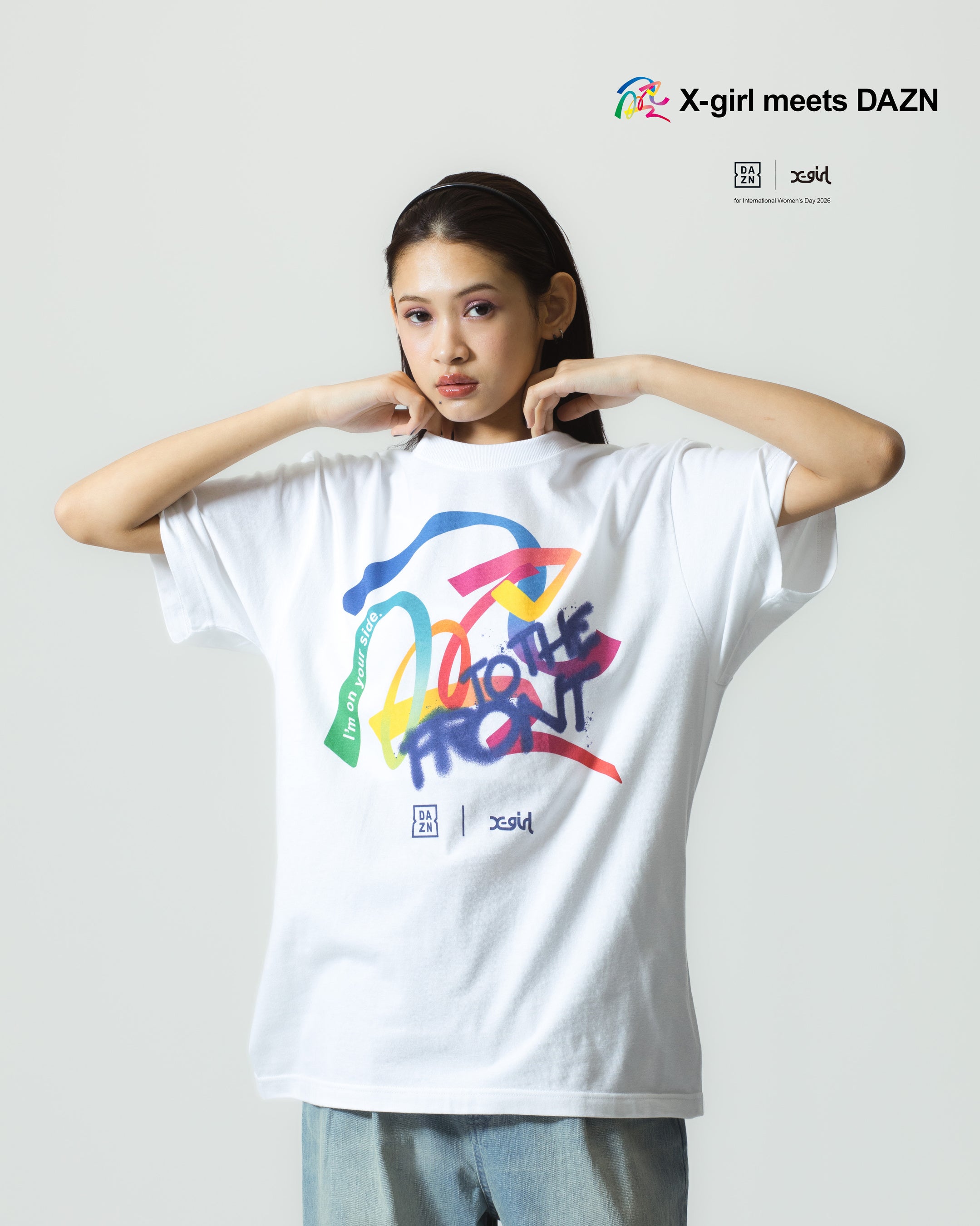 X-girlは時代の変化に合わせ、音楽・カルチャー・スポーツ等のストリートシーンから着想を得て、ファッションを通じ多くのメッセージを伝えてきました。昨年に続き、国際女性デーを記念し制作された「DAZN×X-girl Statement Wear」には、女子スポーツを応援するDAZNとX-girlの想いが込められています。多様性、女性の華やかさを色で表現したリボン様の帯が交差し、繋がっていくデザインにX-girlのブランドメッセージ「TO THE FRONT」を重ねることで、女子アスリートの背中を後押しし、女子スポーツを応援するFAN(ファン)の声援、拍手によって女子アスリートが輝く未来を表現いたしました。