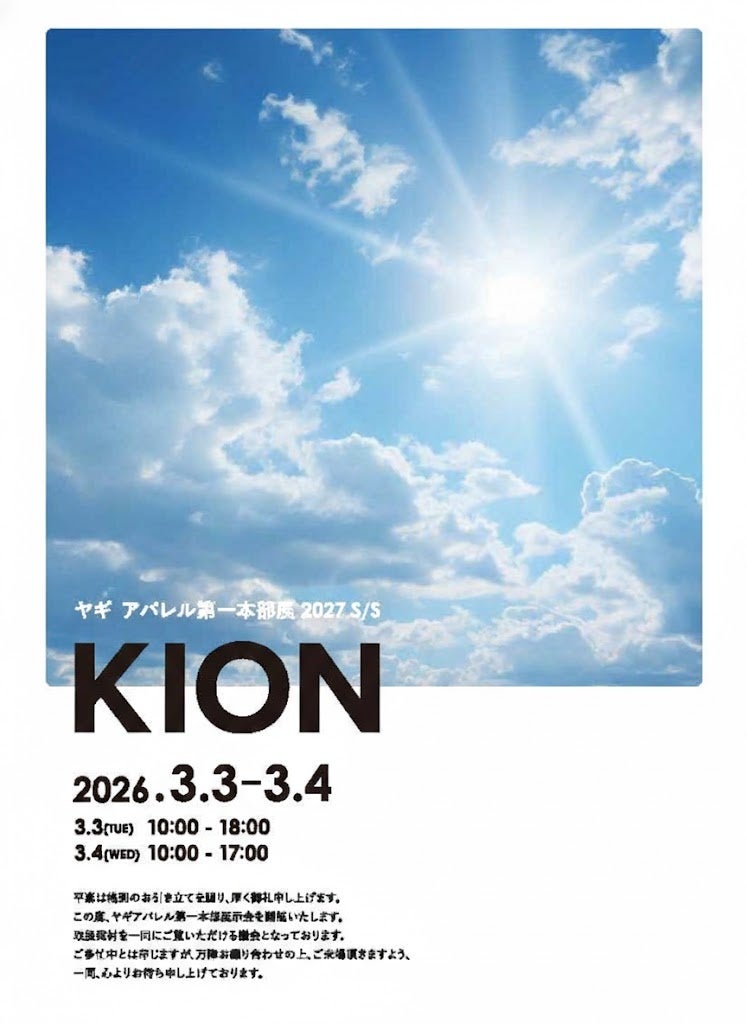 株式会社ヤギ(本社:大阪市中央区・東京都中央区、代表取締役 社長執行役員:八木隆夫、以下 「当社」)は、2026年3月3日(火)・4日(水)の2日間、東京・With原宿にて当社のアパレル第一本部主催による初めての展示商談会「KION展」を開催いたします。