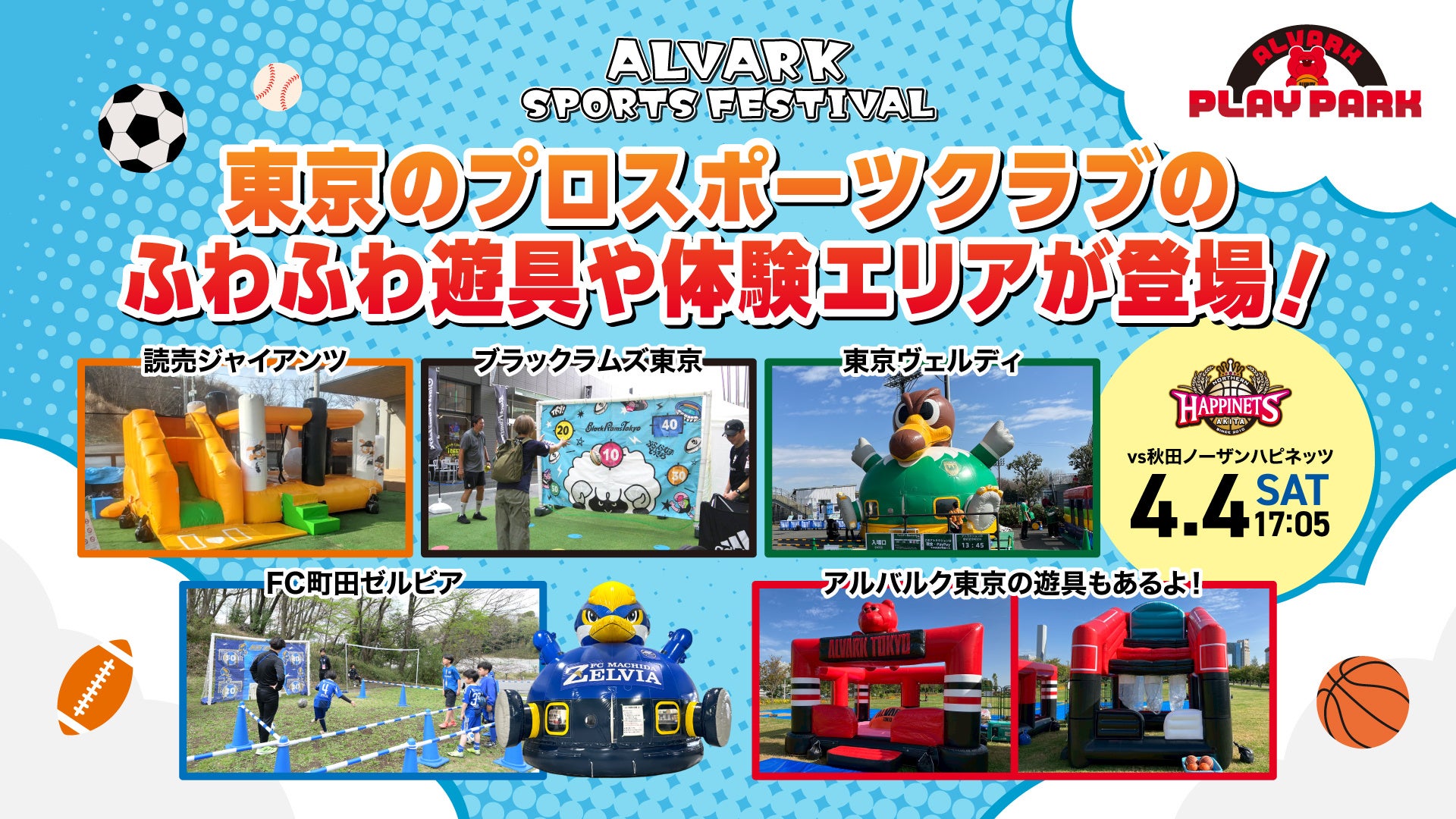 4日(土)は、東京を拠点とするプロスポーツクラブのブースがTOYOTA ARENA TOKYO前の広場、ALVARK PLAY PARKに登場。各クラブ・チームの競技に触れられる体験エリアやふわふわ遊具を設置します。