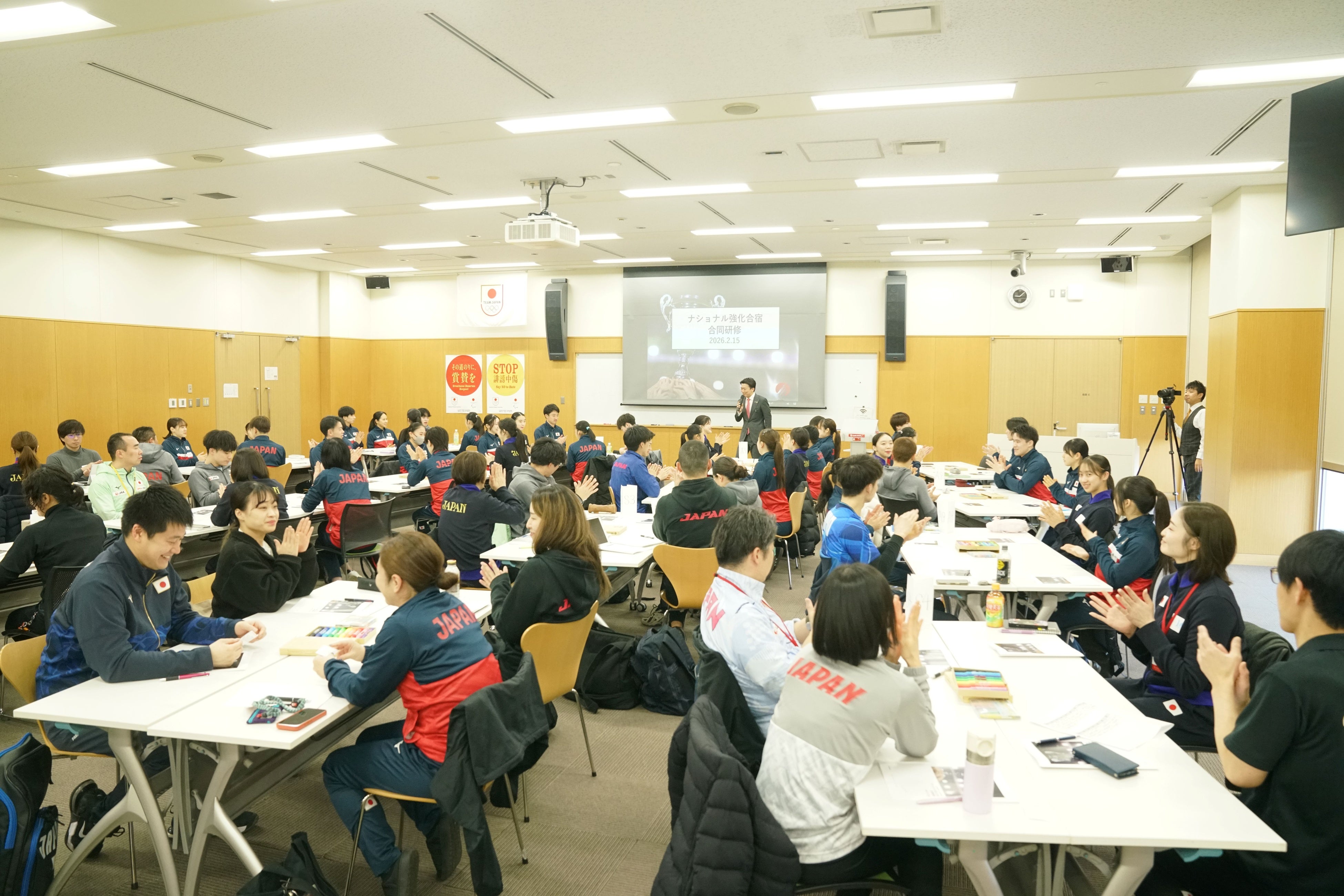 2026年2月15日(日)に味の素ナショナルトレーニングセンターにて体操男子、体操女子、新体操、トランポリン男子、トランポリン女子の日本代表を対象とした「ナショナル合宿 合同研修」が開催されました。本研修では競技の枠を越え、現役トップアスリートから指導者まで総勢約70名が集結。「誰のために、何のために体操をするのか」という揺るぎない原動力となる「目的」や、競技の枠を越えて体操界の未来を描き、日本代表全員で一体感が醸成される研修となりました。