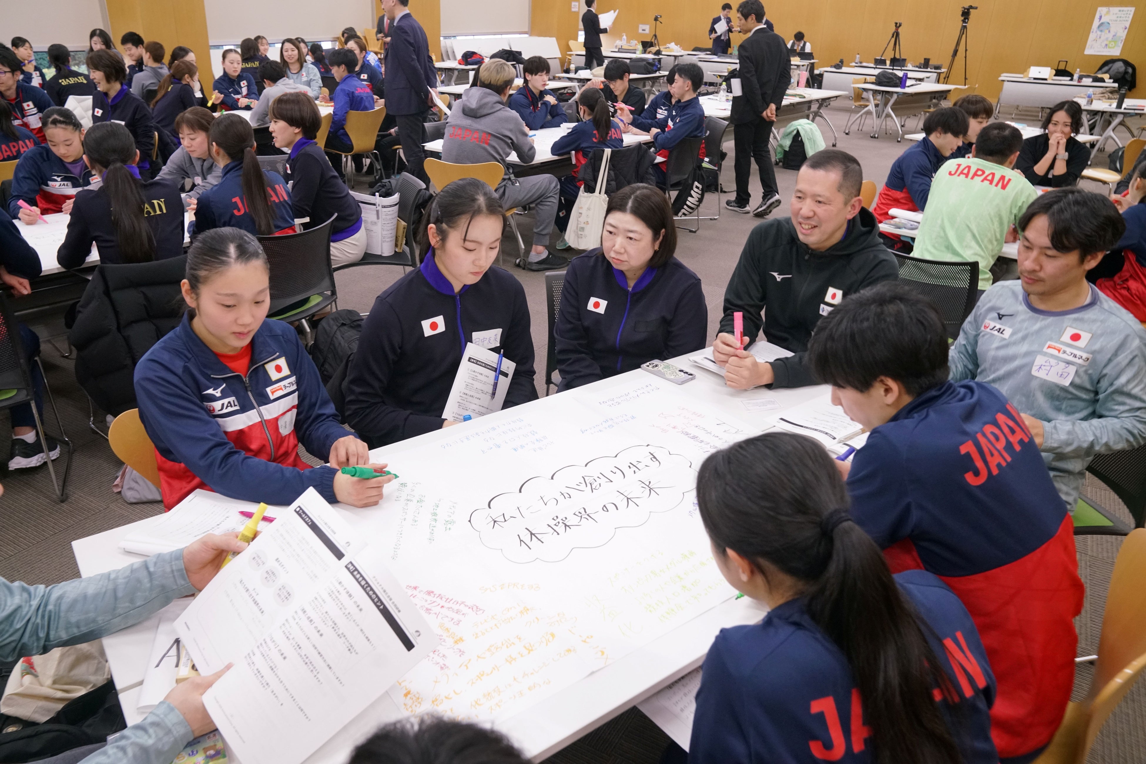 研修のクライマックスでは、コーチ陣も交えて「私たちが創り出す体操界の未来」をテーマに様々なアイディアをポスターに書き出すワークショップが実施。「プロリーグが開設され、当たり前に地上波で放送されるスポーツにしたい」「幅広い世代に身近に感じていただけるように、体操のアニメやドキュメンタリー番組が放送される未来を目指したい」などお互いのアイディアを承認しあい、体操界が創り出す未来を全員で描いていきました。