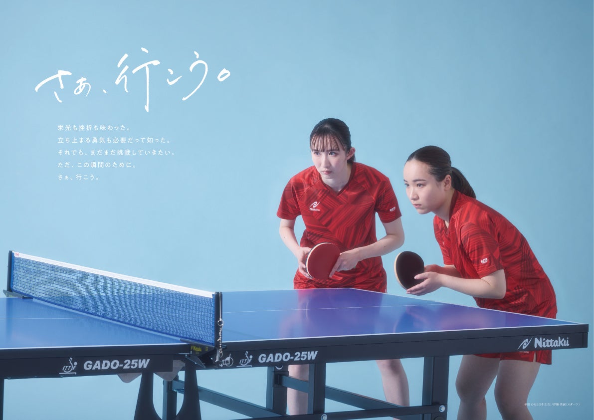 カタログの表2見開きにも登場するキービジュアルでは、卓球台を前にダブルスのレシーブを構え、ラリーが始まる直前の張りつめた空気感を演出。これまで積み上げてきた自信を胸に、ともに挑み続ける姿を表しています。