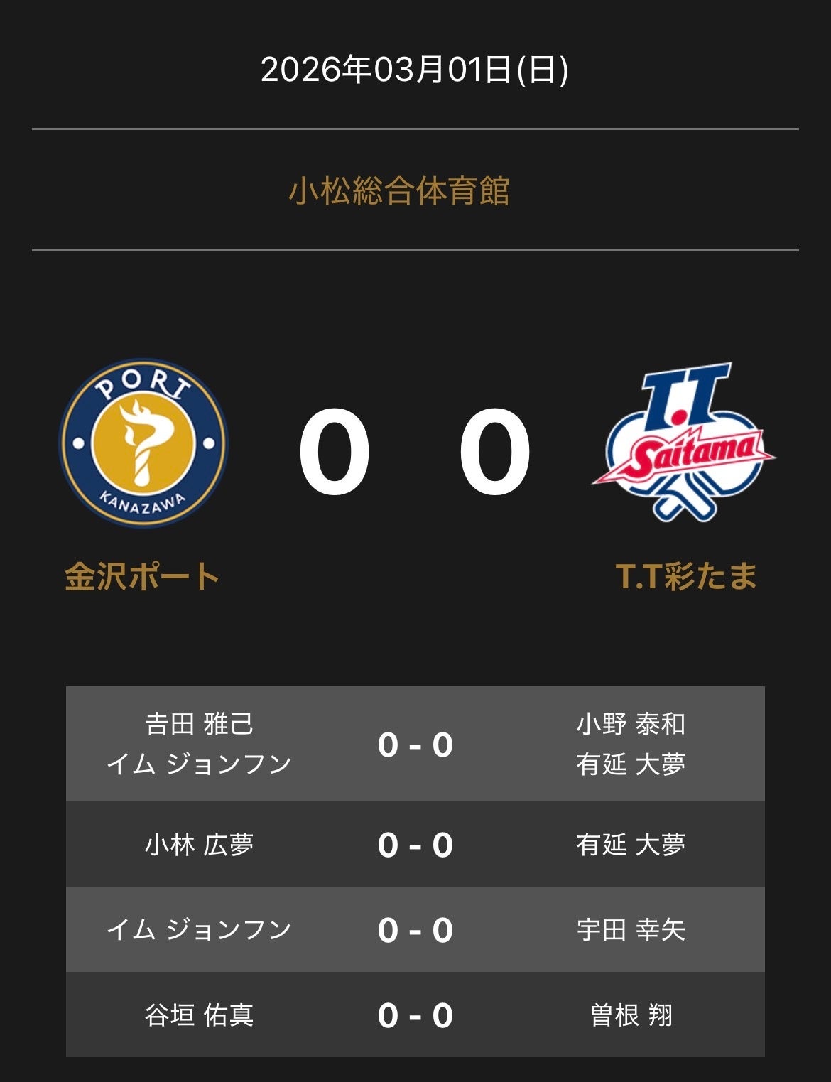ノジマTリーグ 2025-2026シーズン 公式戦 3月1日(日)開催 金沢ポート vs T.T彩たま 対戦オーダーを発表いたします。