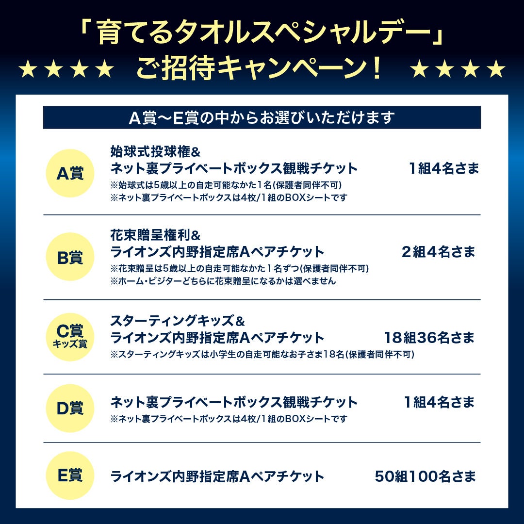 「育てるタオルスペシャルデー」開催を記念して、始球式への参加権利や観戦チケットなど、当日をより特別なものにする豪華特典をご用意しました。
