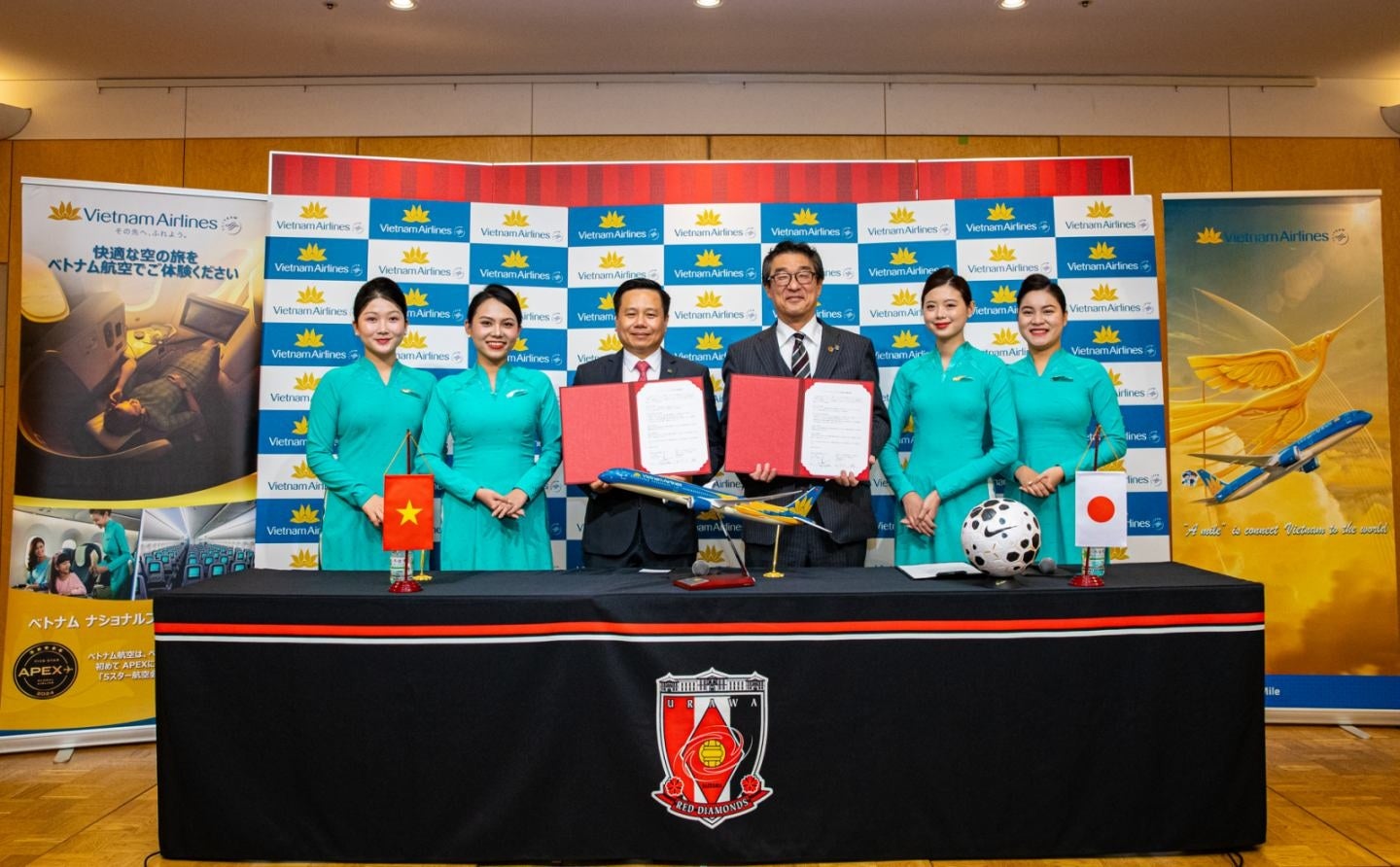 当日は、浦和レッズ 代表 田口誠様、日本支社長 ゴー・シー・アインが登壇し、両者による調印が執り行われました。会場にはベトナム航空の客室乗務員も登場し、華やかな雰囲気の中でフォトセッションが行われました。