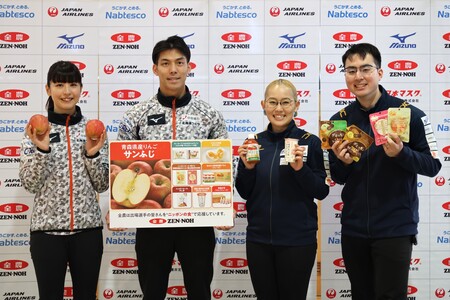 全農は優勝チームへ副賞を贈呈するほか、出場選手の皆さんのハーフタイムや試合前後でのエネルギー補給用の飲食を提供します。3月2日(月)に行われた大会前記者会見の後に、選手を代表して前回優勝の「松村・谷田」、準優勝の「小穴・青木」に、提供する食材のパネルをお渡ししました。青森県産りんご「サンふじ」を全チームに1ケース(5キロ)ずつ提供したほか、大会期間中に選手エリアに設置する「もぐもぐブース」では、JAグループのプライベートブランド「エーコープマーク品」の「もちもちミルクパン」、全農の商品ブランド「ニッポンエール」の新商品「雫グミ 岡山県産清水白桃」を取り揃えました。