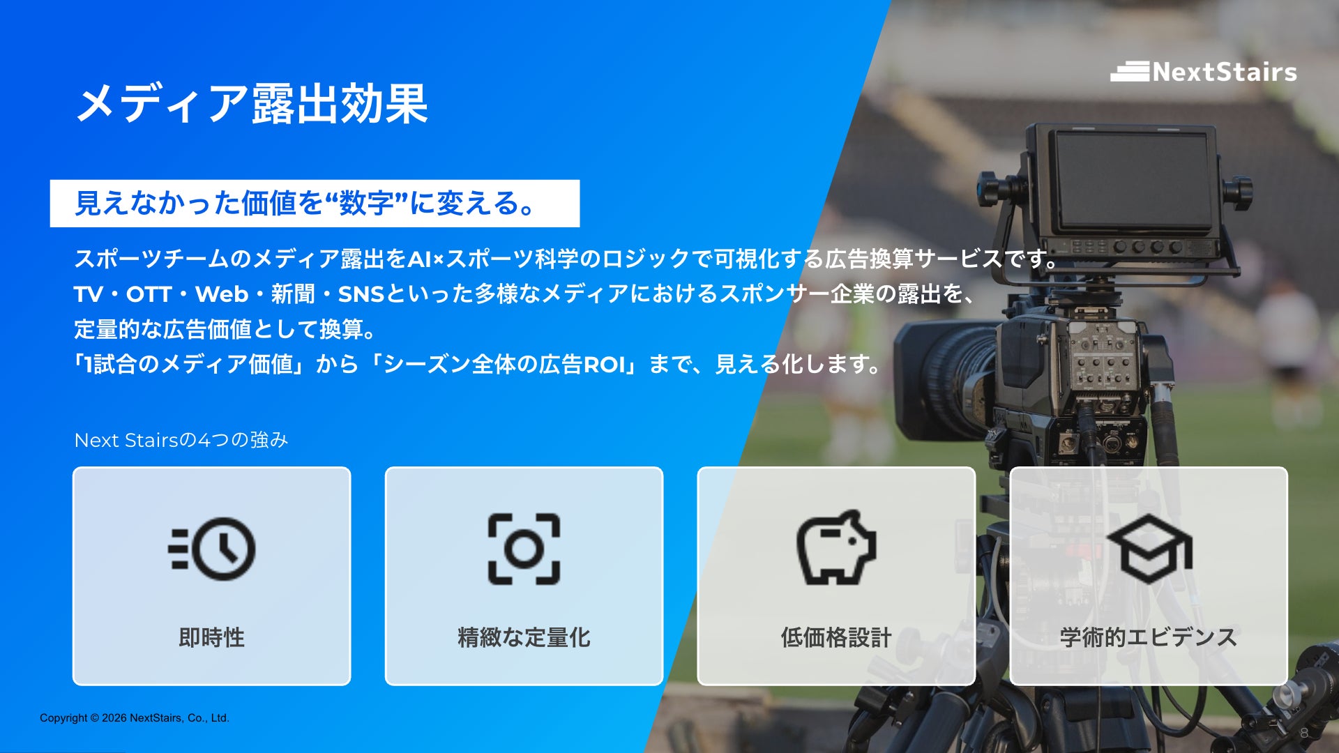 株式会社NextStairsは「インサイトを通じて、あらゆるスポーツの価値を高める」をミッションとし、AI×テクノロジーの力におけるデータ分析技術を駆使して、インサイトを導き出し、スポーツチームが直面する課題の解決をすることで、あらゆるスポーツの価値を高めることができる社会を実現したいと考えております。