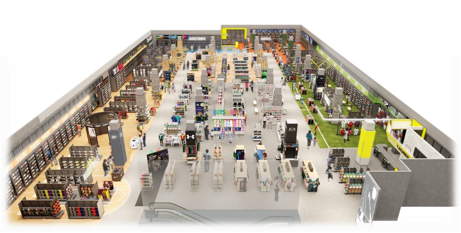売場面積約1,500坪を誇る北海道エリア最大級の体験型店舗として、日常に溶け込むランニング・フィットネス・アパレルから、プロ仕様の野球・サッカー・バスケットボール等の専門競技アイテムまで、圧倒的なスケールで展開。