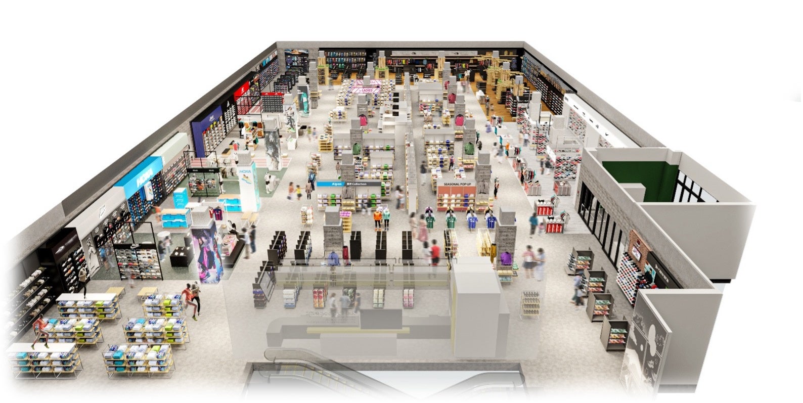 さらに、「スポーツデポ」と「アルペンアウトドアーズ」の境界を越えたシームレスな売場づくりを実現し、季節の移ろいを感じさせる演出とともに、スポーツとアウトドアが融合した新たな価値を提供します。