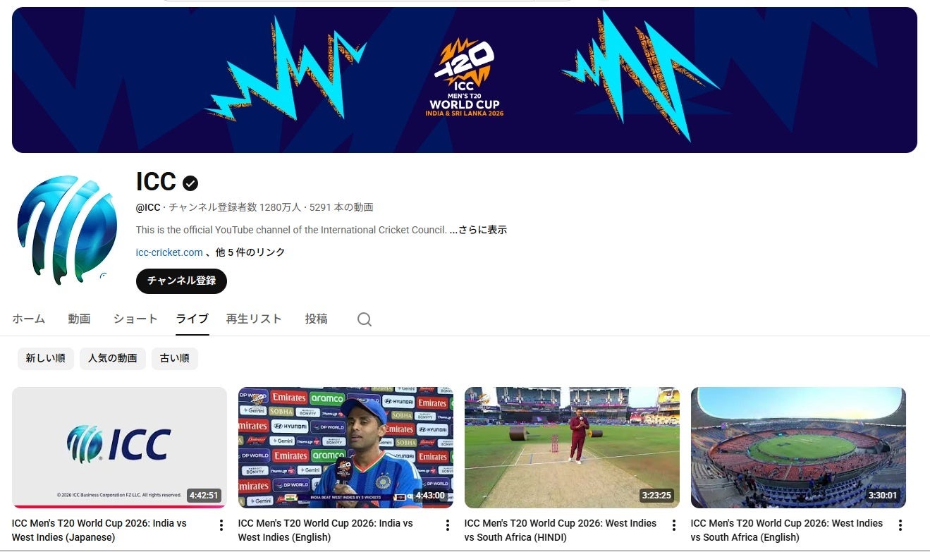 本配信は、ワールドカップの主催団体ICC(国際クリケット評議会)の公式YouTube、及びFacebookにて実施されます。