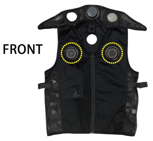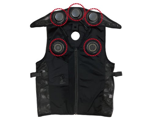 ベスト部分に5箇所、ネックカバー部分に3箇所の設置位置を用意し、使用シーンや姿勢に合わせた配置が可能です。