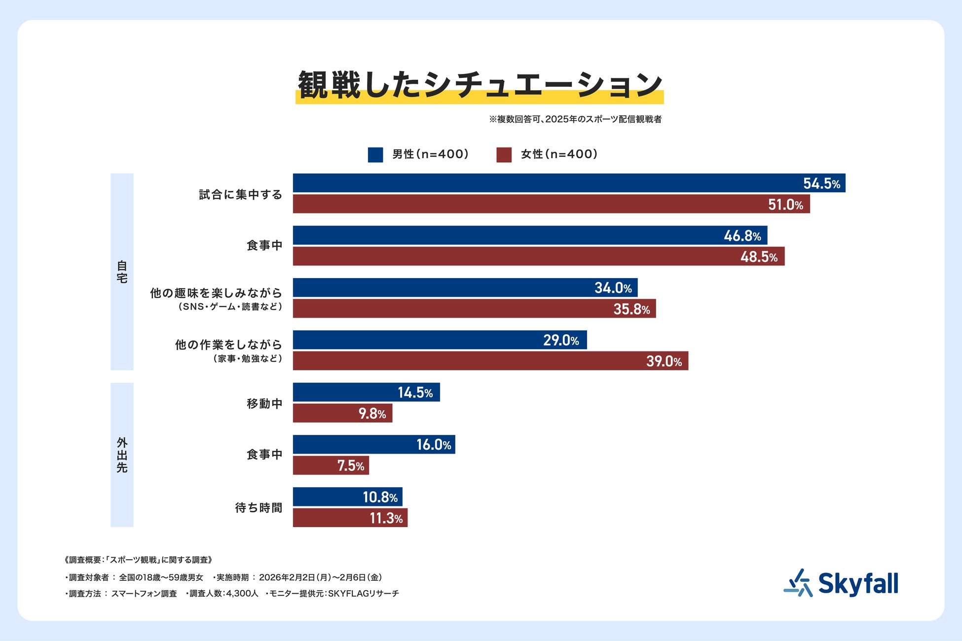 株式会社Skyfall(本社:東京都港区、代表取締役社長:長谷川 智一、以下Skyfall)が運営するマーケティングリサーチ事業の一環として、全国の18歳から59歳の男女4,300人を対象に、「スポーツ観戦」に関する調査(調査期間:2026年2月2日(月)~2月6日(金))を『SKYFLAGリサーチ』を用いて実施しました。