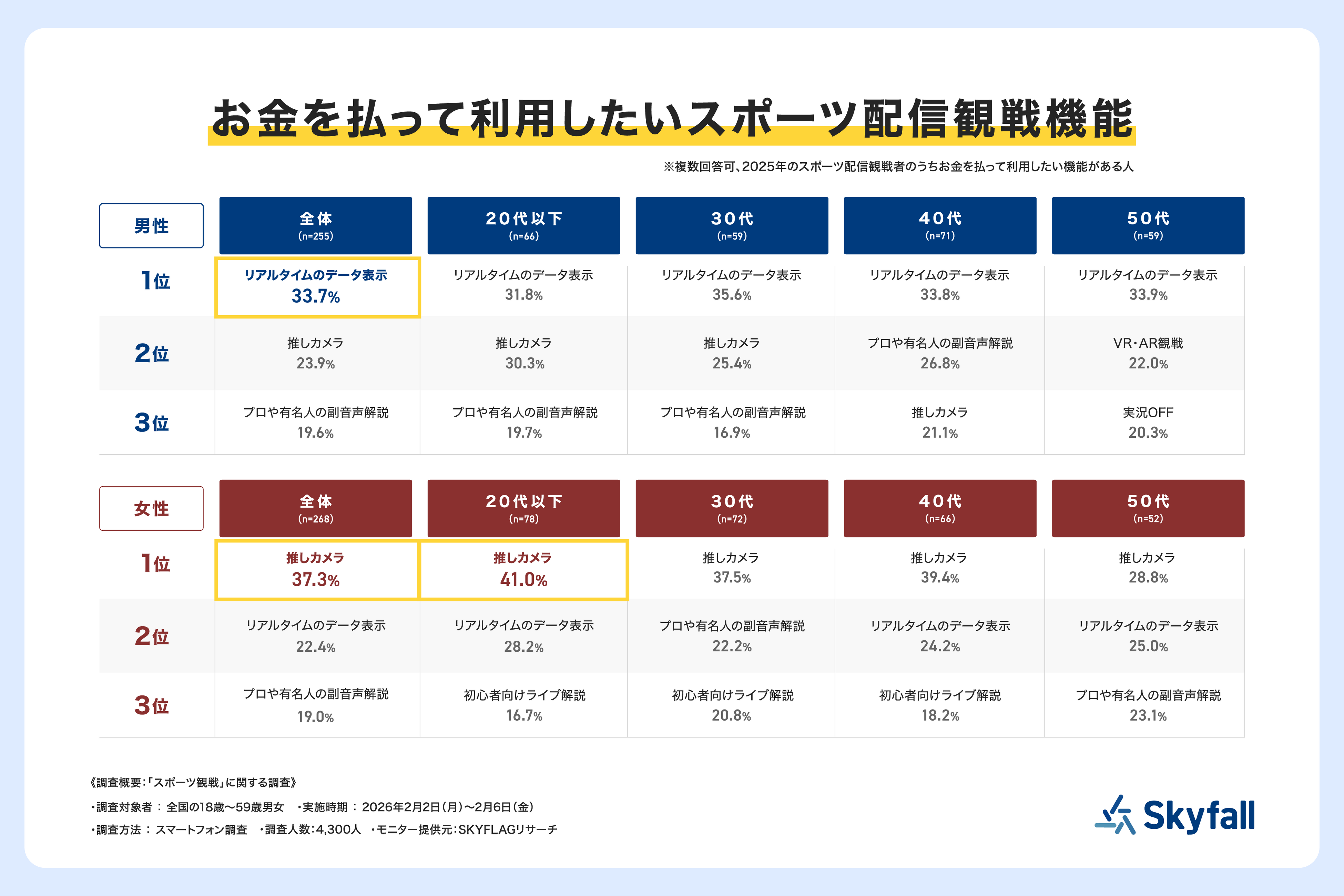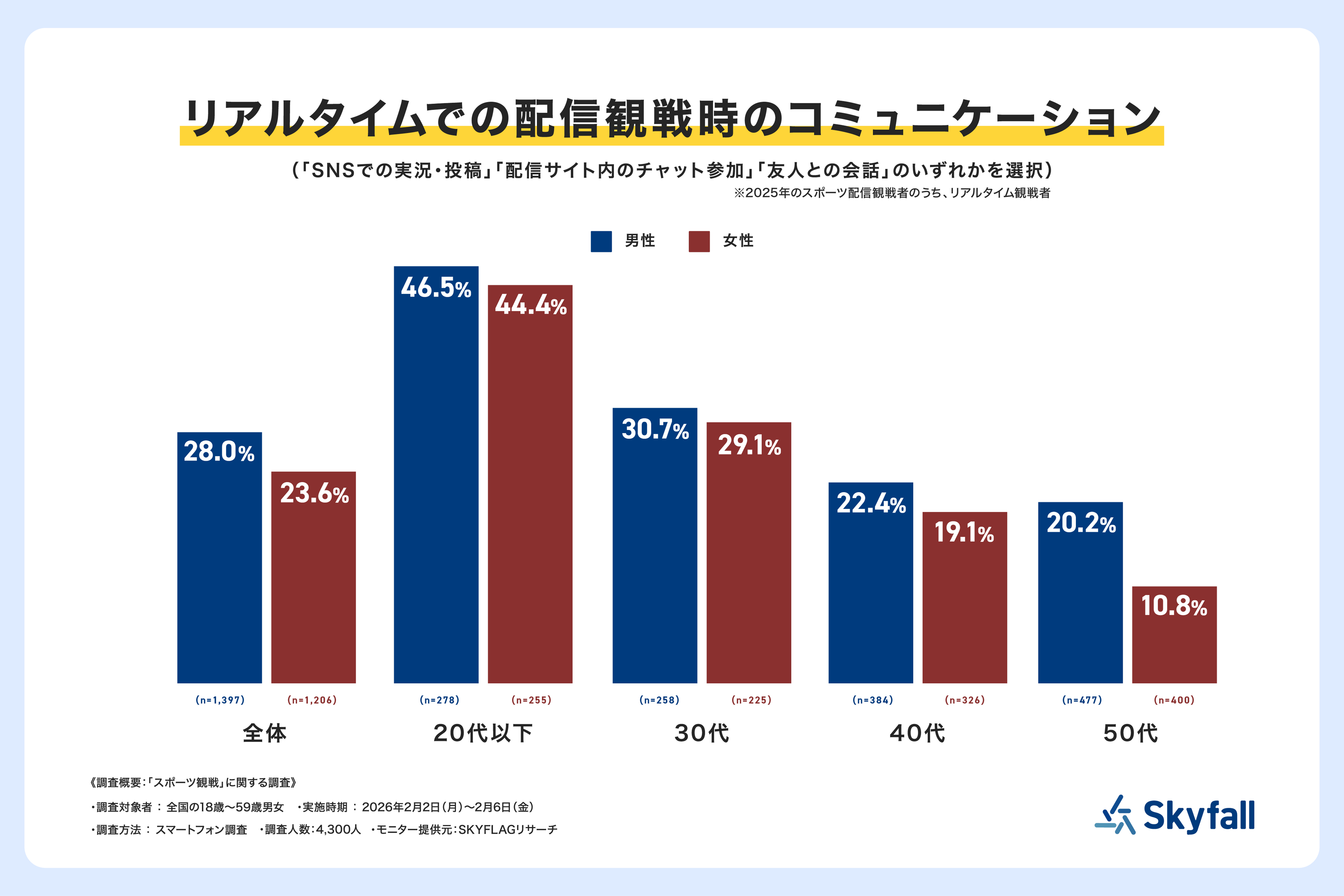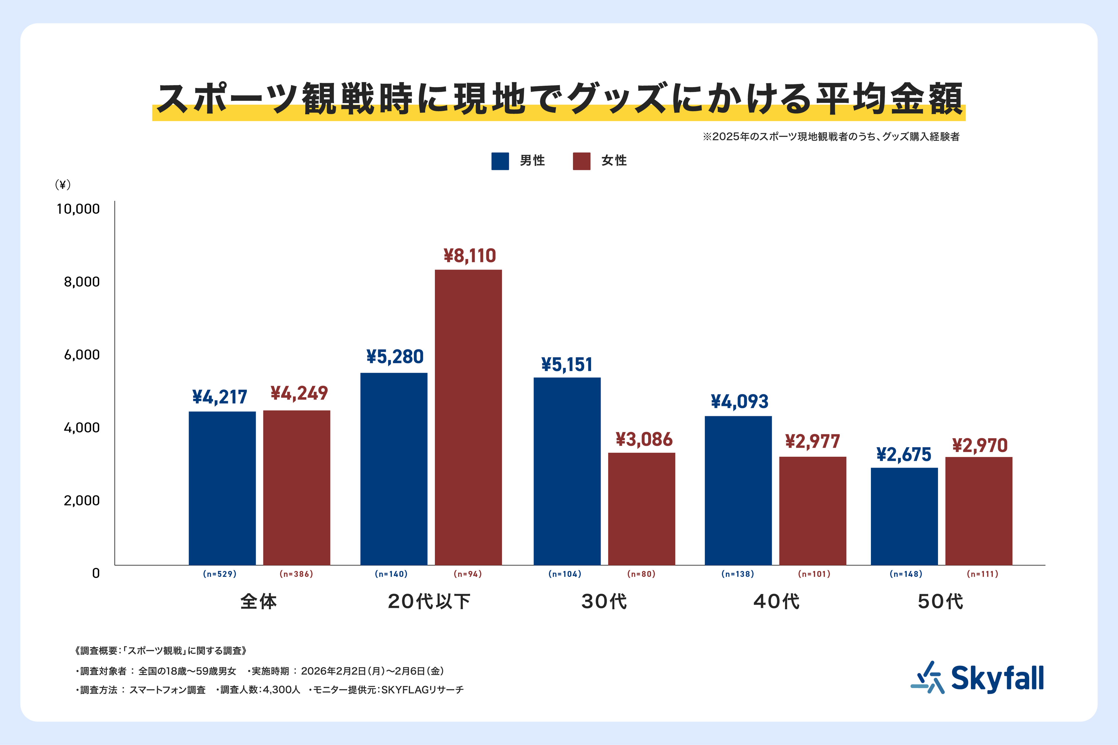 株式会社Skyfall(本社:東京都港区、代表取締役社長:長谷川 智一、以下Skyfall)が運営するマーケティングリサーチ事業の一環として、全国の18歳から59歳の男女4,300人を対象に、「スポーツ観戦」に関する調査(調査期間:2026年2月2日(月)~2月6日(金))を『SKYFLAGリサーチ』を用いて実施しました。