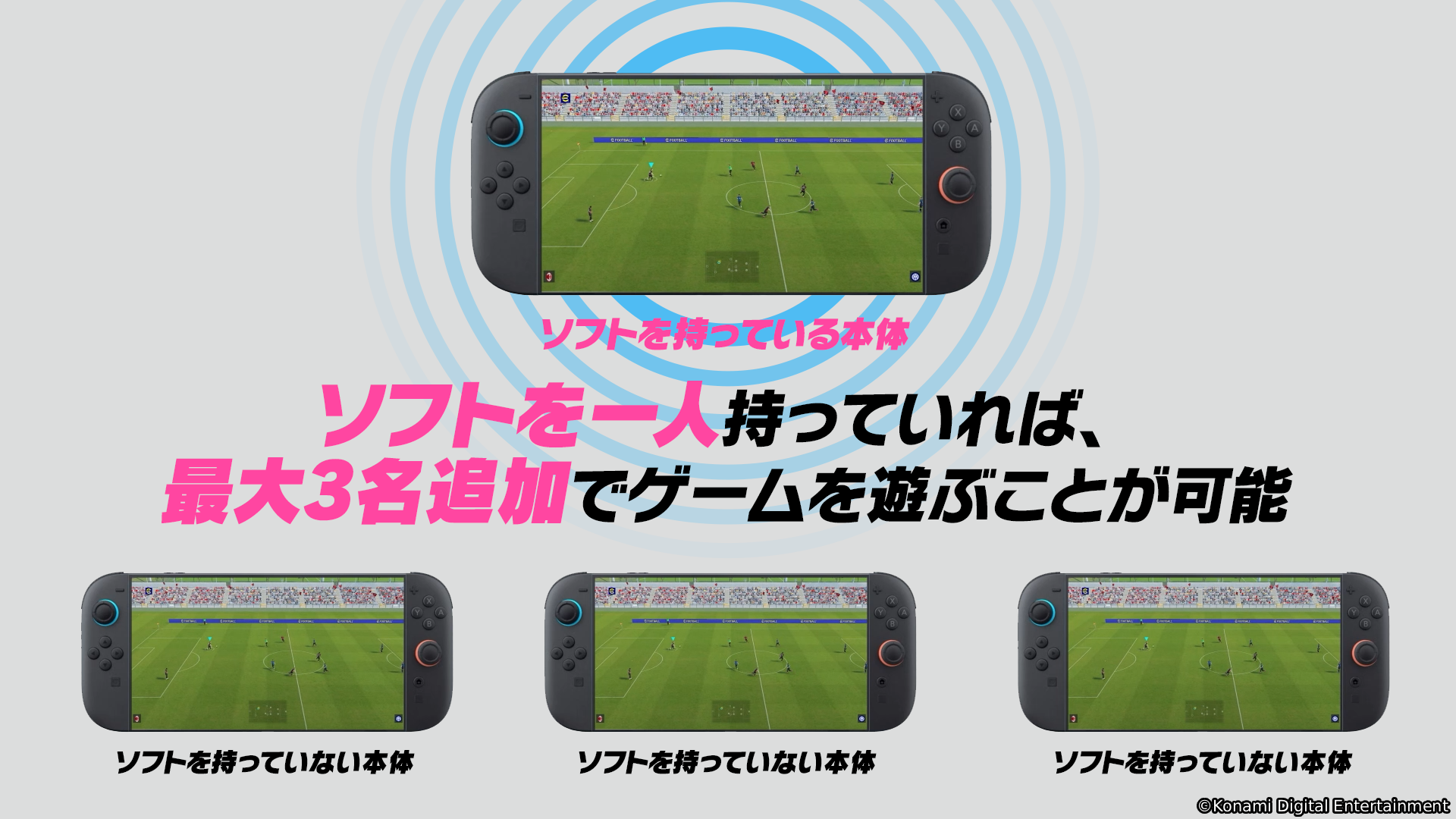 また、『eFootball™ Kick-Off!』を持っていない方とも、本体を持ち寄って対戦できる「おすそわけ通信(ローカル通信)」にも対応しています。
