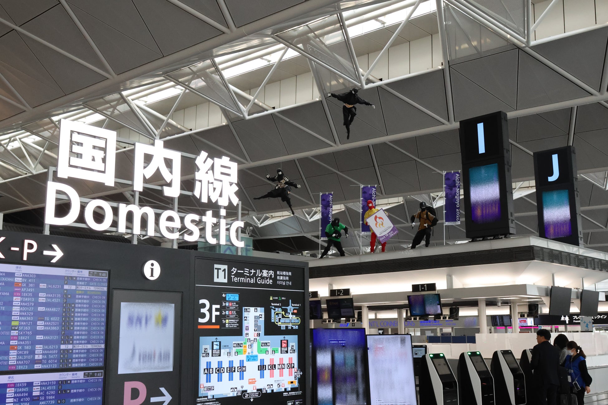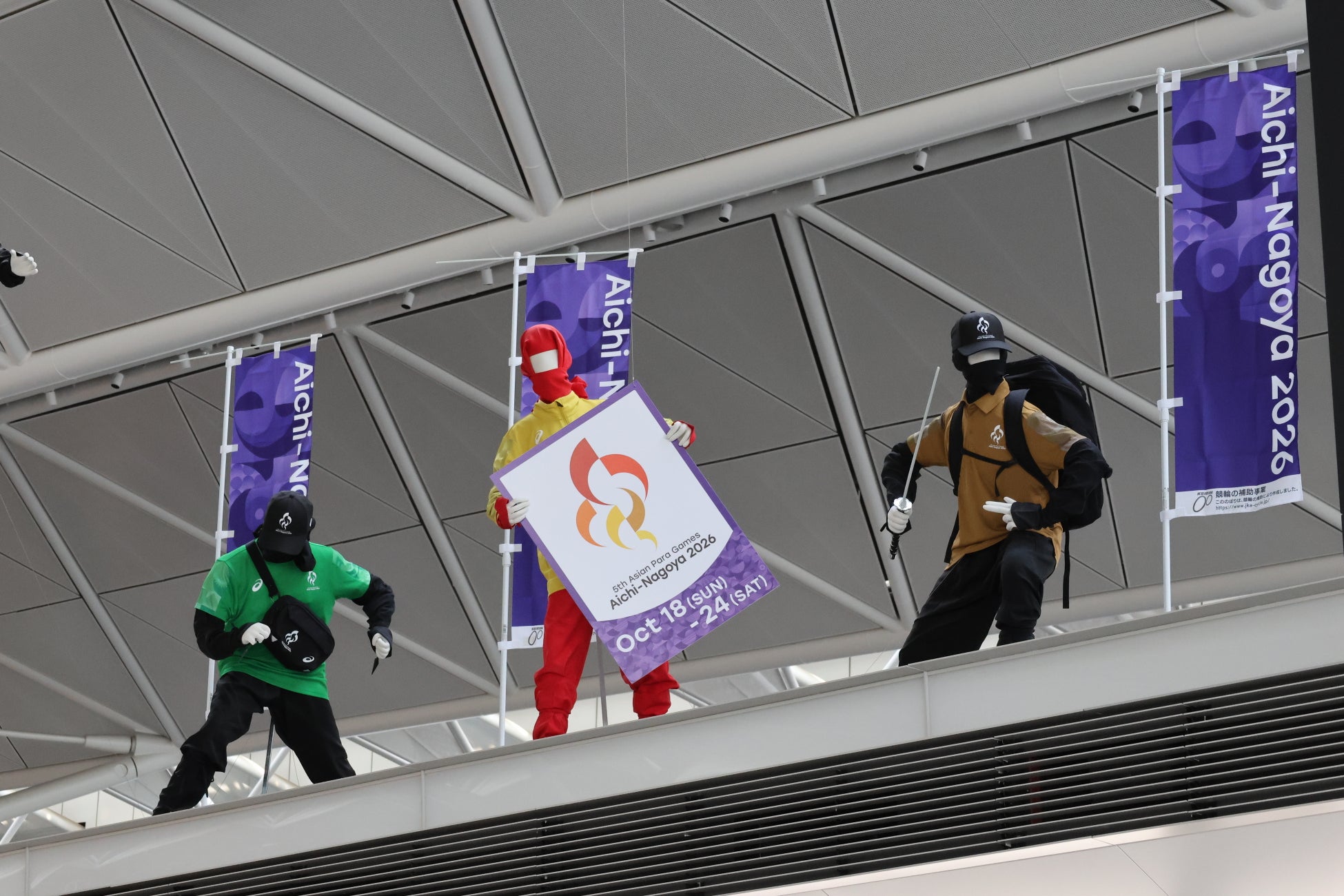空港館内には忍者が潜んでおり、アジアパラ競技大会に向けて、忍者たちが大会ボランティア装束を身にまとい、みなさまをお出迎えしています。