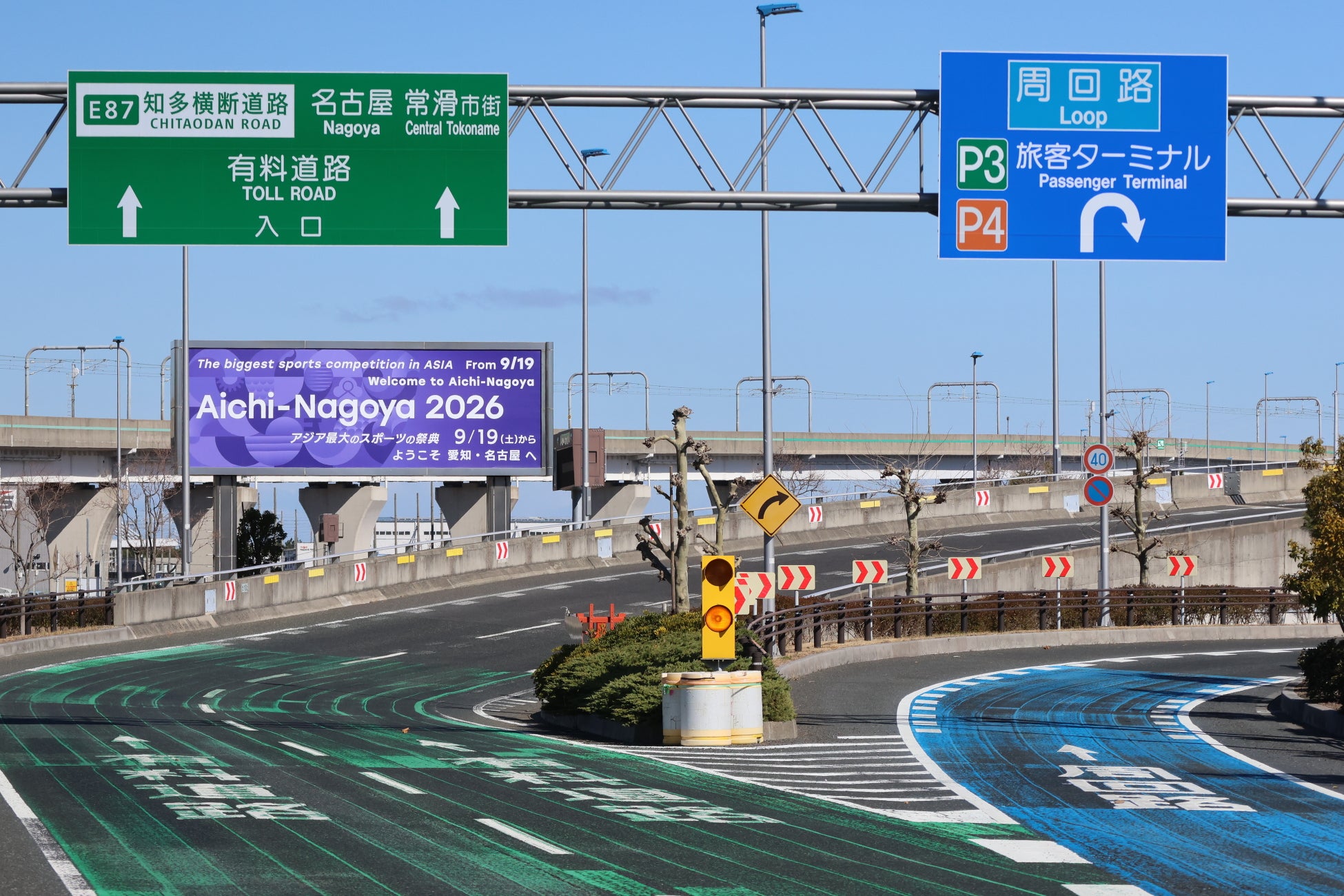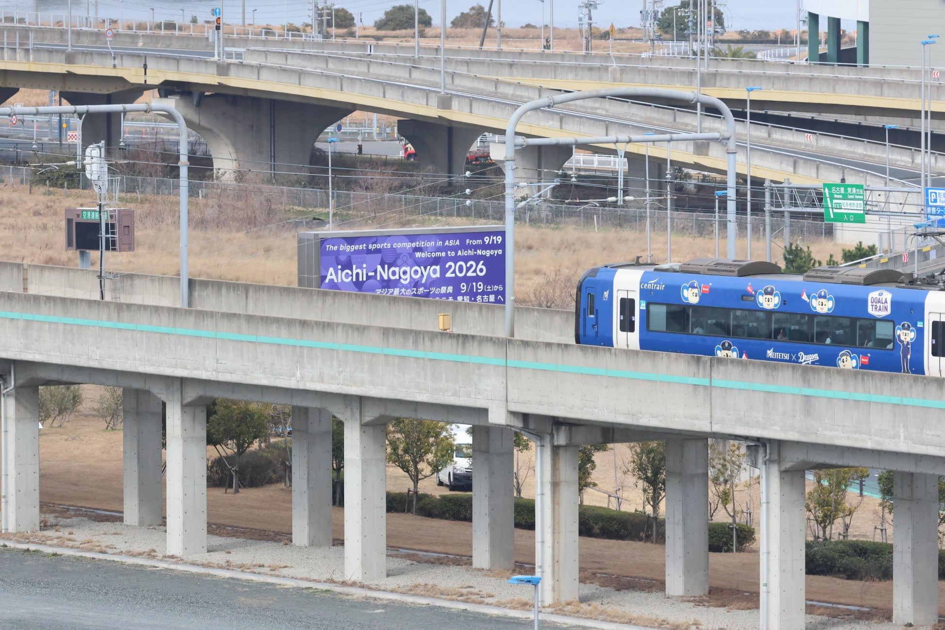空港島までの連絡橋出入口にある大型看板にもウェルカム装飾を展開します。