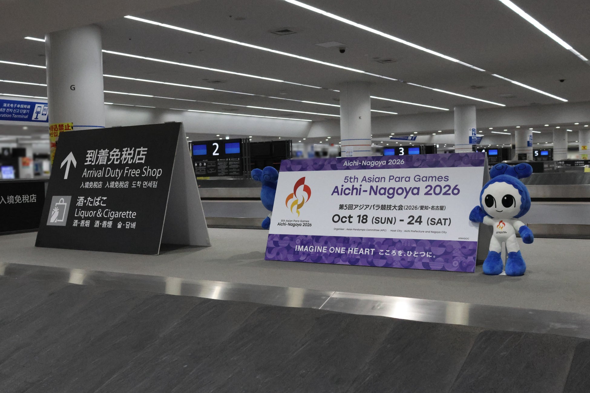 国際線ご利用のお客様が機内預け荷物を受け取るバゲージクレームにアジアパラ競技大会のマスコットキャラクター「ウズミン」人形を設置します。