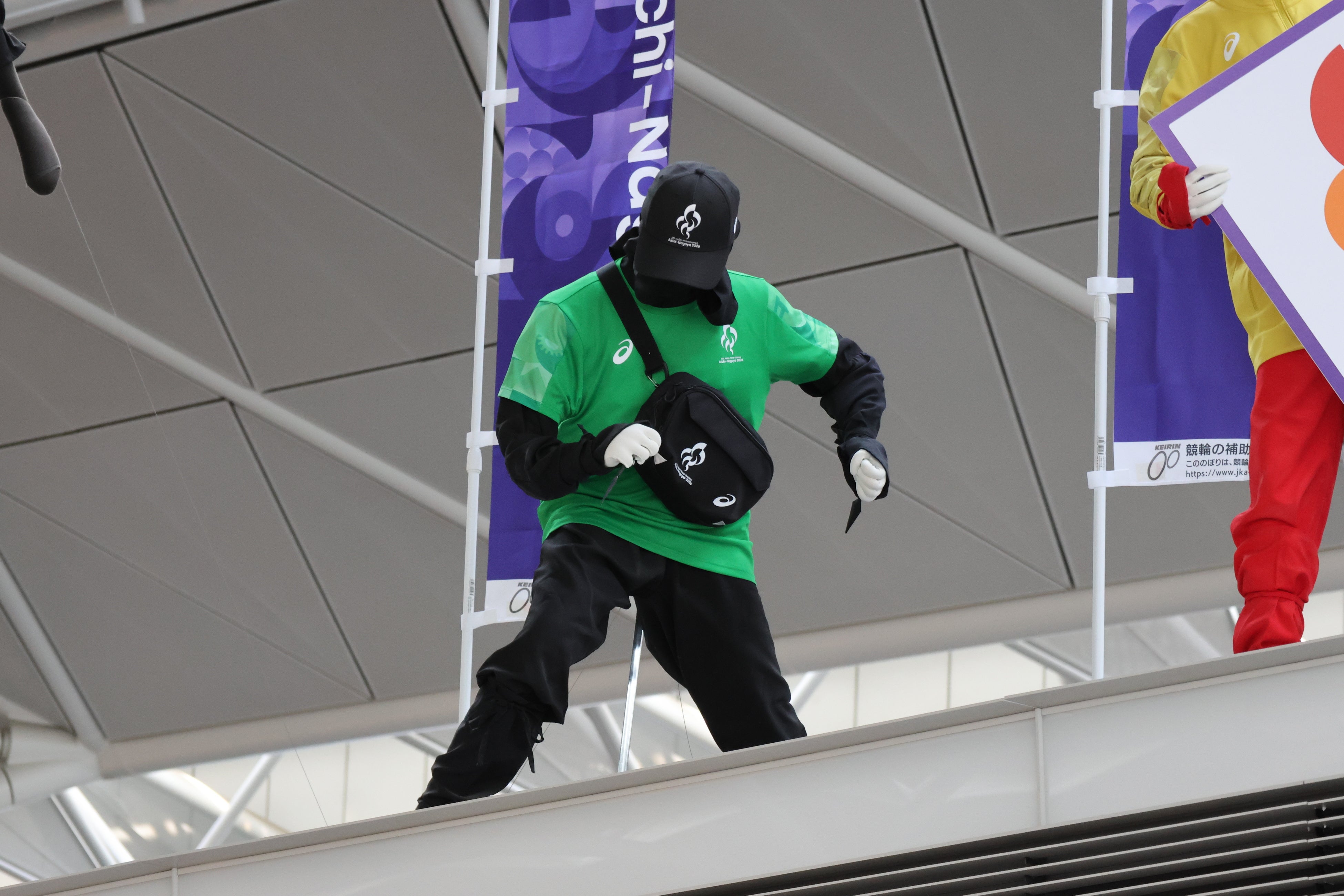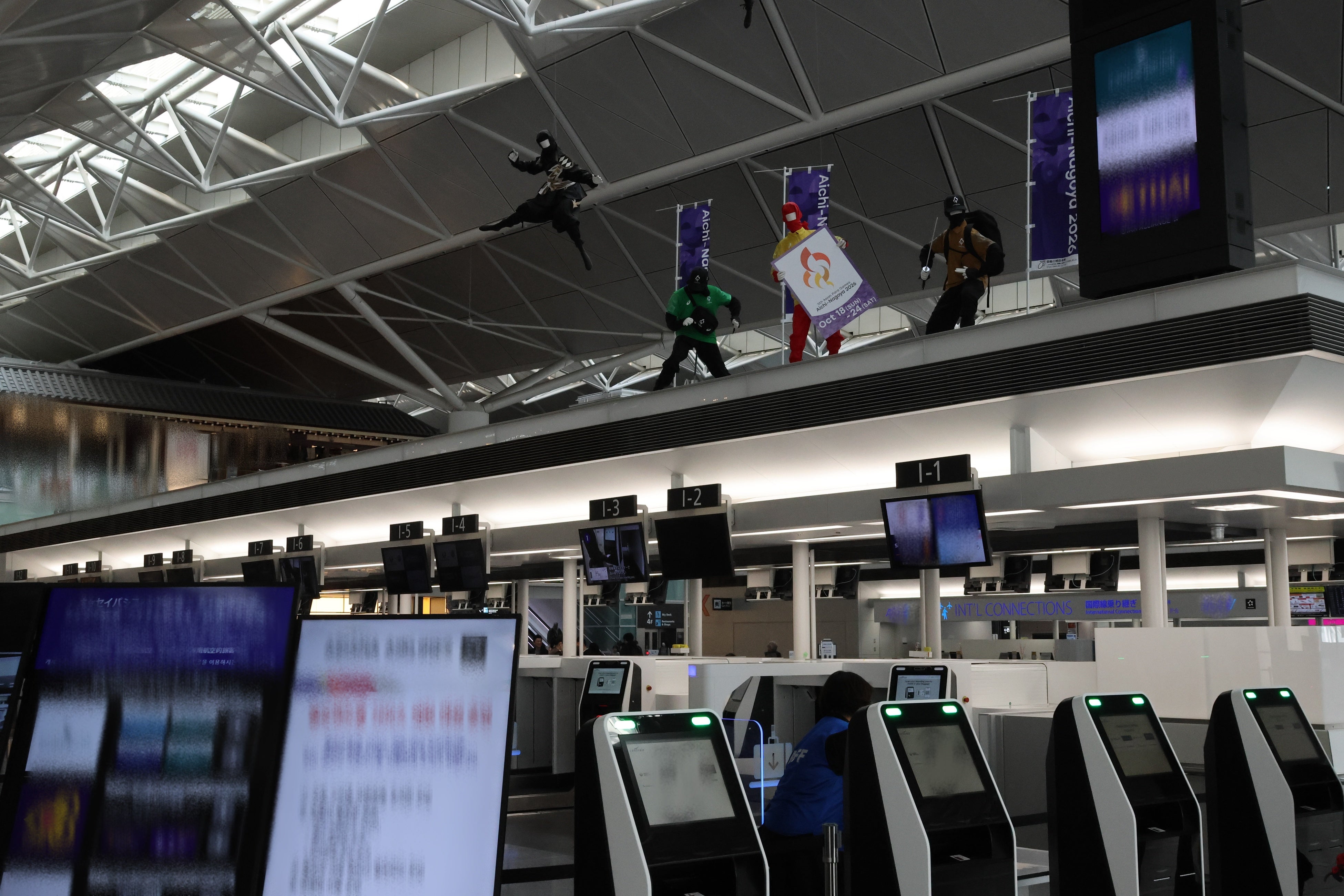 空港館内には忍者が潜んでおり、アジアパラ競技大会に向けて、忍者たちが大会ボランティア装束を身にまとい、みなさまをお出迎えしています。