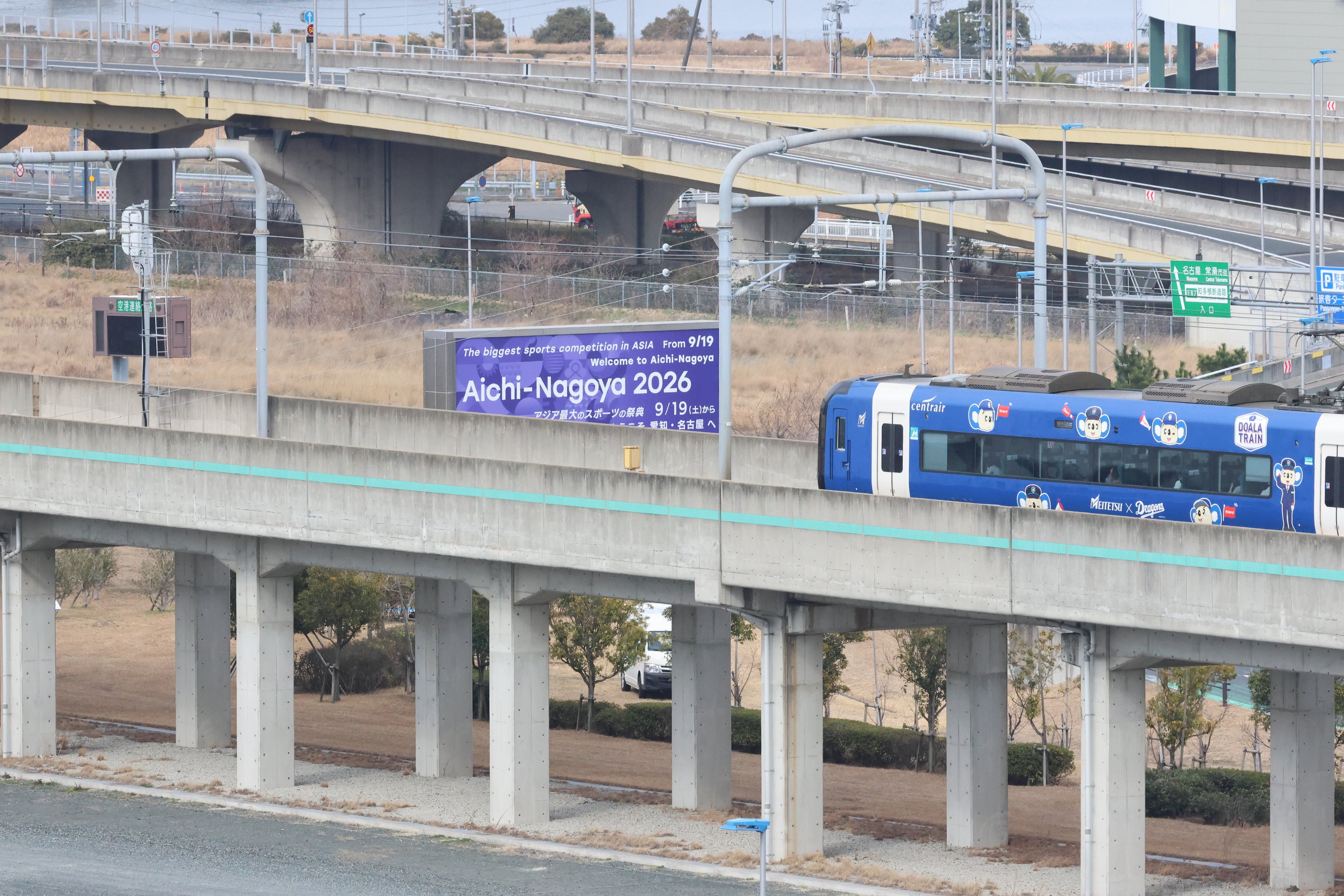 空港島までの連絡橋出入口にある大型看板にもウェルカム装飾を展開します。