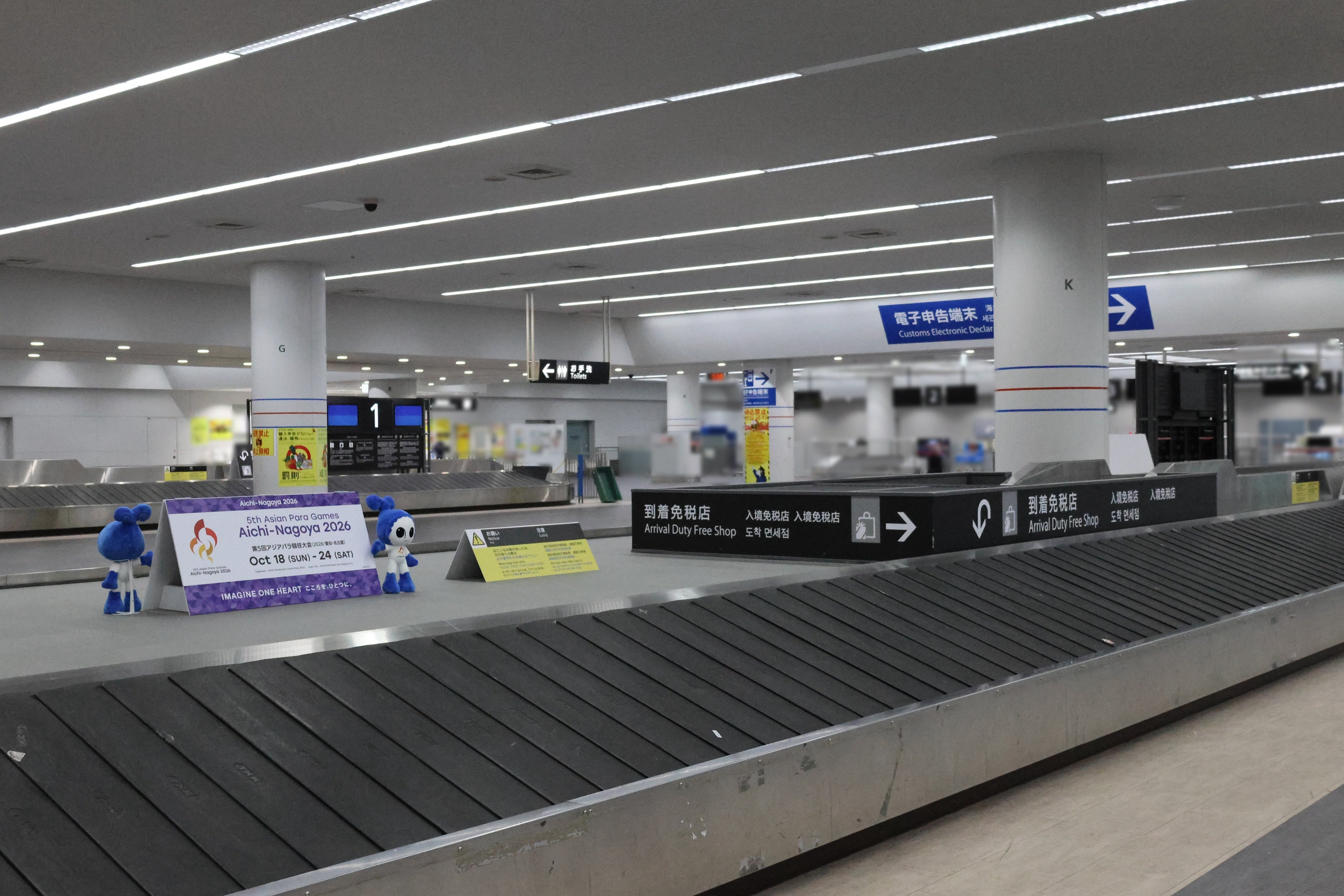 国際線ご利用のお客様が機内預け荷物を受け取るバゲージクレームにアジアパラ競技大会のマスコットキャラクター「ウズミン」人形を設置します。