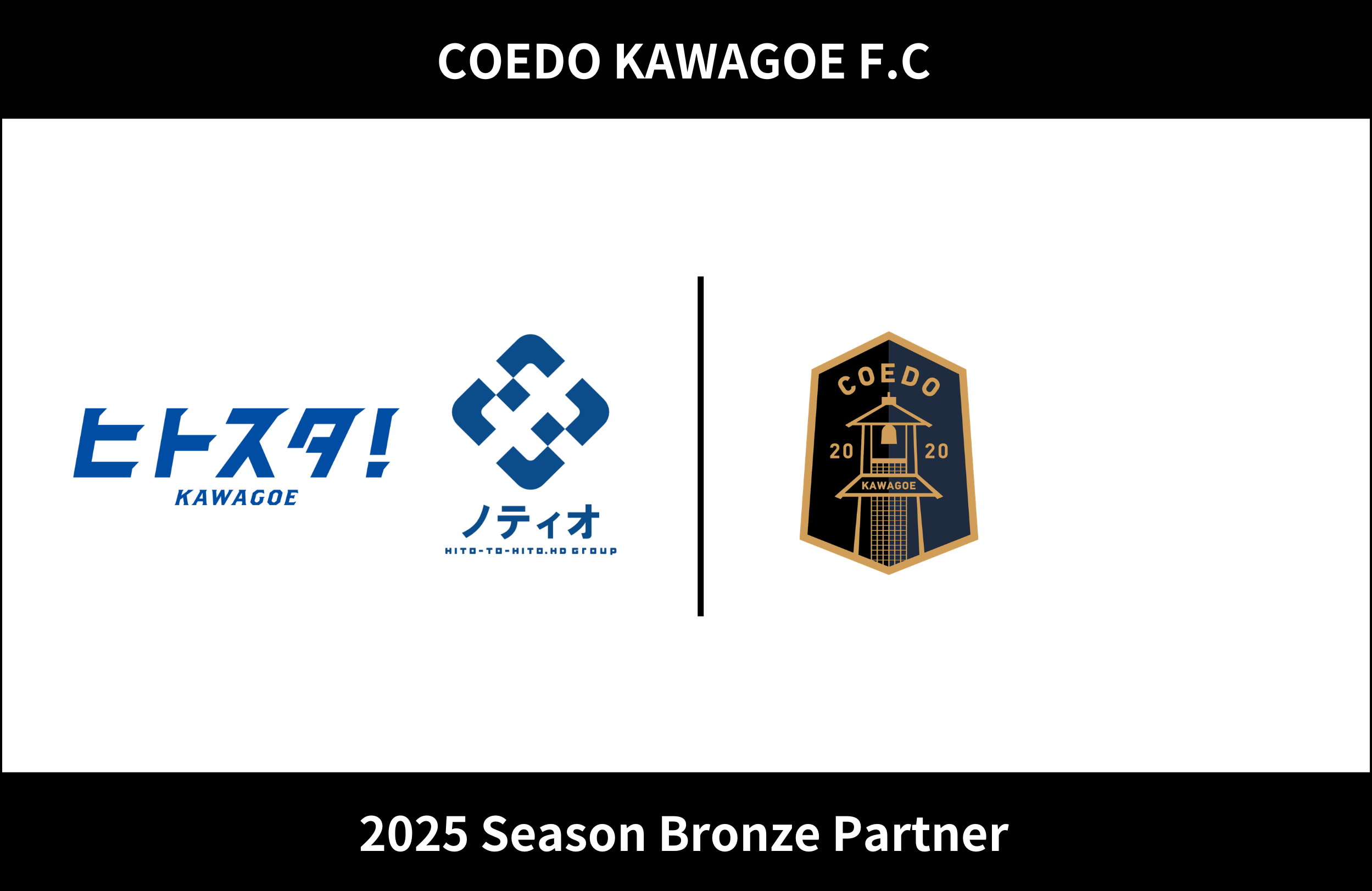 COEDO KAWAGOE F.Cを運営するCOEDO KAWAGOE F.C株式会社(埼玉県川越市、代表取締役 有田和生)は、川越市南大塚に位置し、プロ野球球場と同様の人工芝を採用した屋内型多目的運動施設で、スポーツの練習をはじめ、ダンスやヨガ、各種イベントなど幅広い用途で利用できる「ヒトスタ!川越」を運営する株式会社ノティオ(東京都渋谷区、代表取締役 松本哲裕)と、2025シーズンのブロンズパートナー契約を締結したことをお知らせいたします。