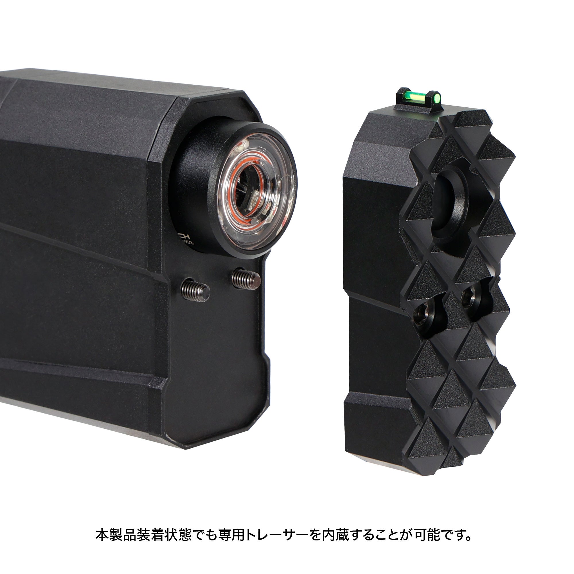 別売りの専用トレーサーを使用することで、本製品を装着した状態でも蓄光BB弾の発光機能を使用することが可能です。