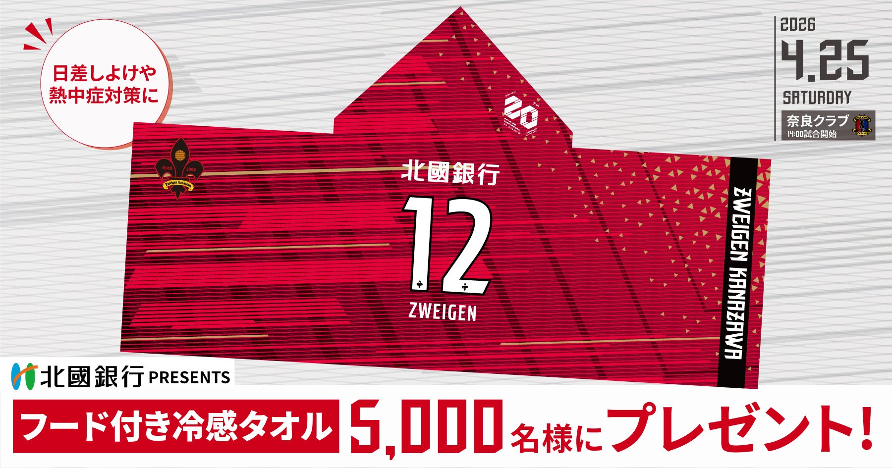 このたび、ツエーゲン金沢(J3)では、オフィシャルパートナーである北國銀行とのコラボレーション企画として、4月25日(土)開催の明治安田J2・J3百年構想リーグ第12節 奈良クラブ戦において、「フード付き冷感タオル」を来場者プレゼントとして5,000枚配布することとなりましたので、お知らせいたします。