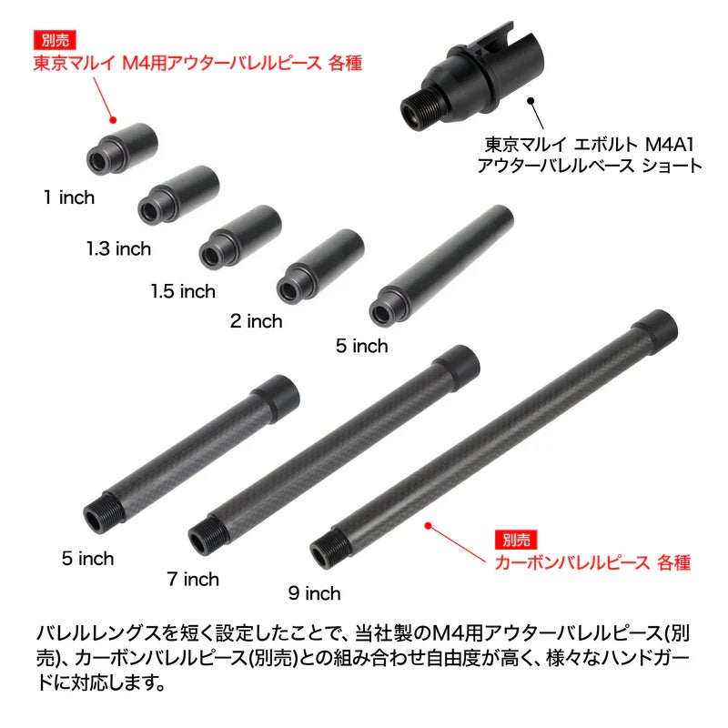 バレルレングスを短く設定することで、当社製のM4用アウターバレルピースやカーボンバレルピースと組み合わせたカスタムが可能になります。