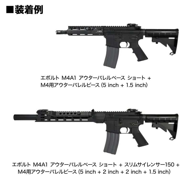 バレルレングスを短く設定することで、当社製のM4用アウターバレルピースやカーボンバレルピースと組み合わせたカスタムが可能になります。