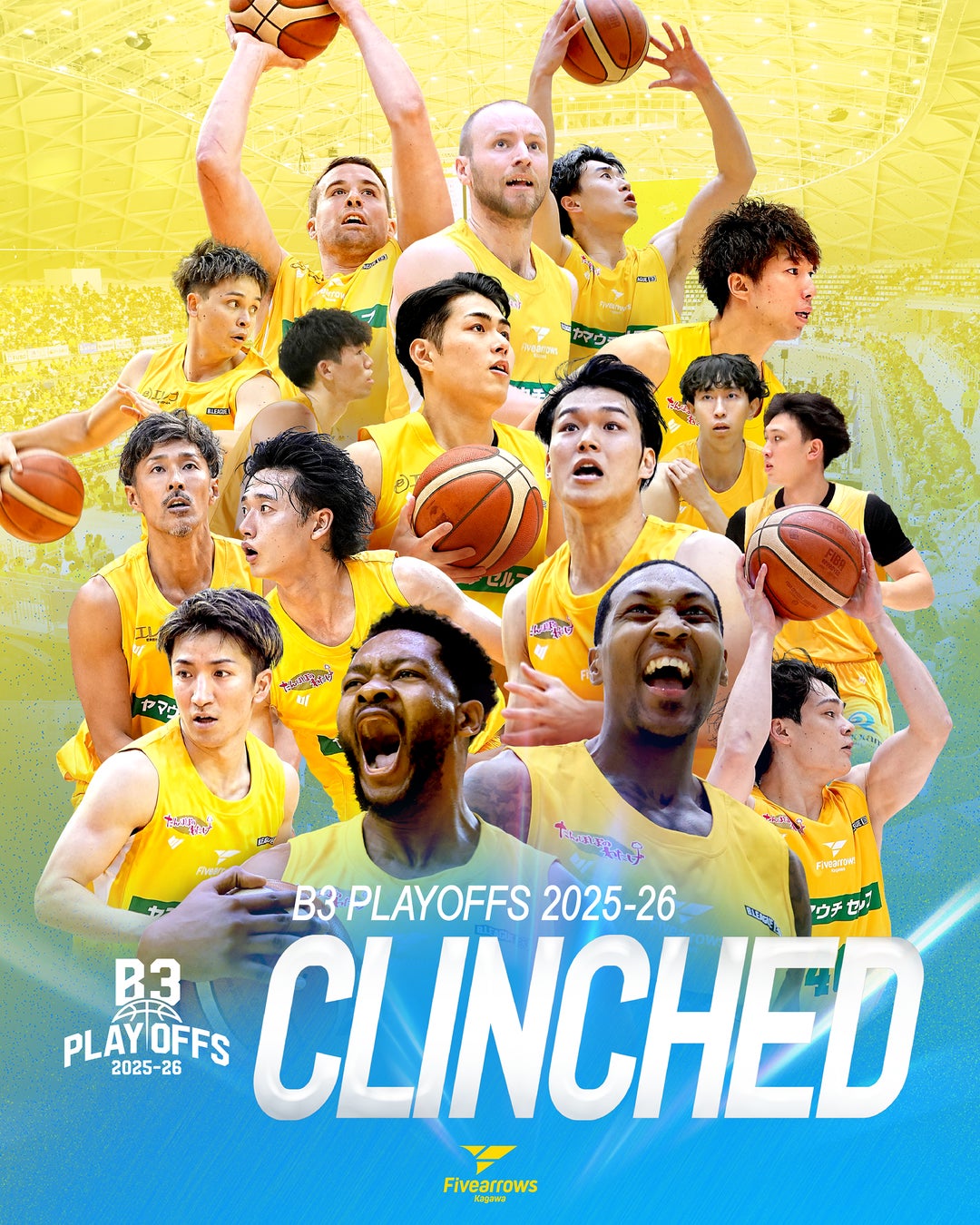 B3リーグ レギュラーシーズン 2025-26 第23節 2026年3月7日(土)の試合結果をもちまして、香川ファイブアローズの8位以上が確定し、「B3リーグ プレーオフ 2025-26」への進出が決定したことをお知らせいたします!