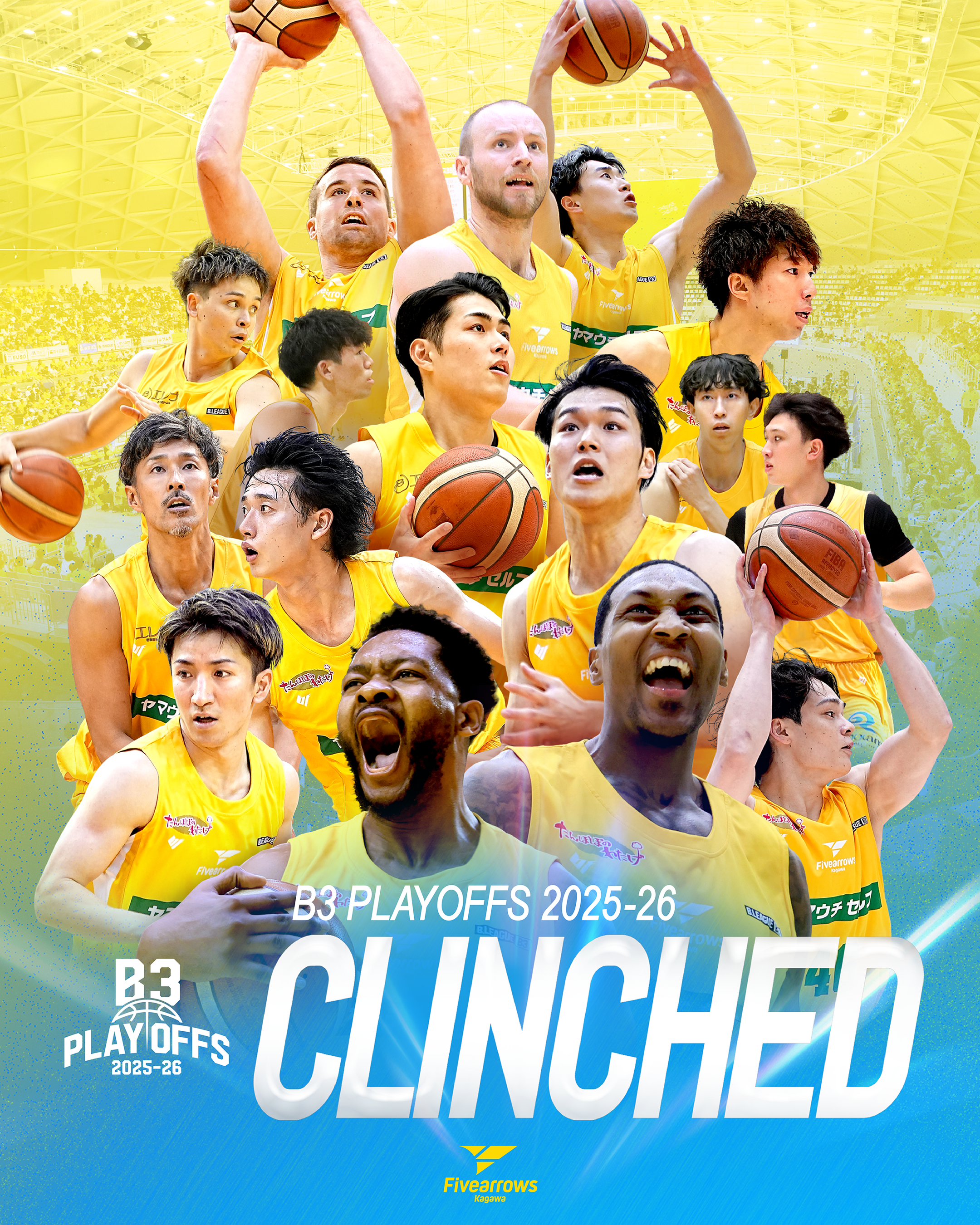 B3リーグ レギュラーシーズン 2025-26 第23節 2026年3月7日(土)の試合結果をもちまして、香川ファイブアローズの8位以上が確定し、「B3リーグ プレーオフ 2025-26」への進出が決定したことをお知らせいたします!