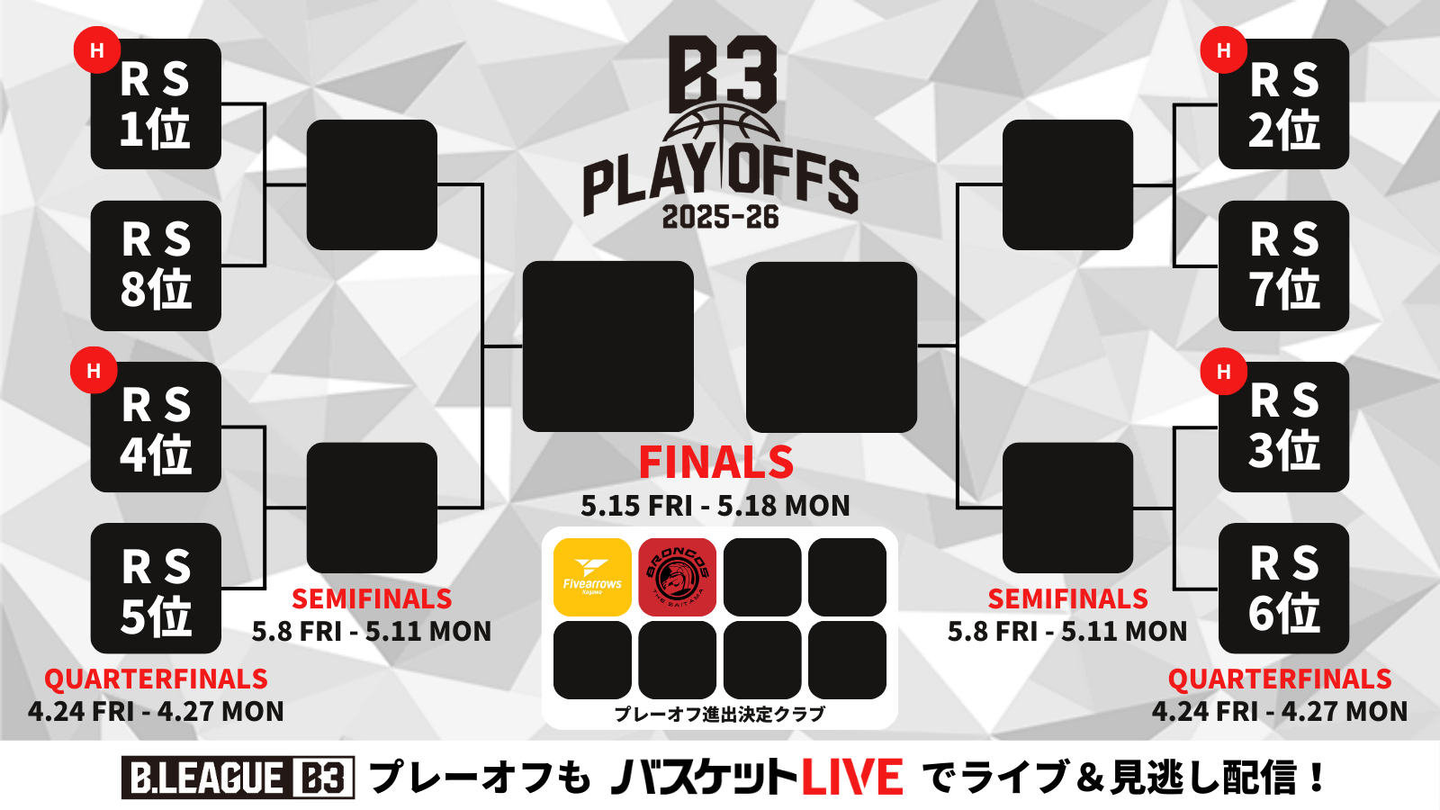 残りの「B3リーグ レギュラーシーズン 2025-26」 の試合結果によって、ホーム開催権や組み合わせが決定いたします。