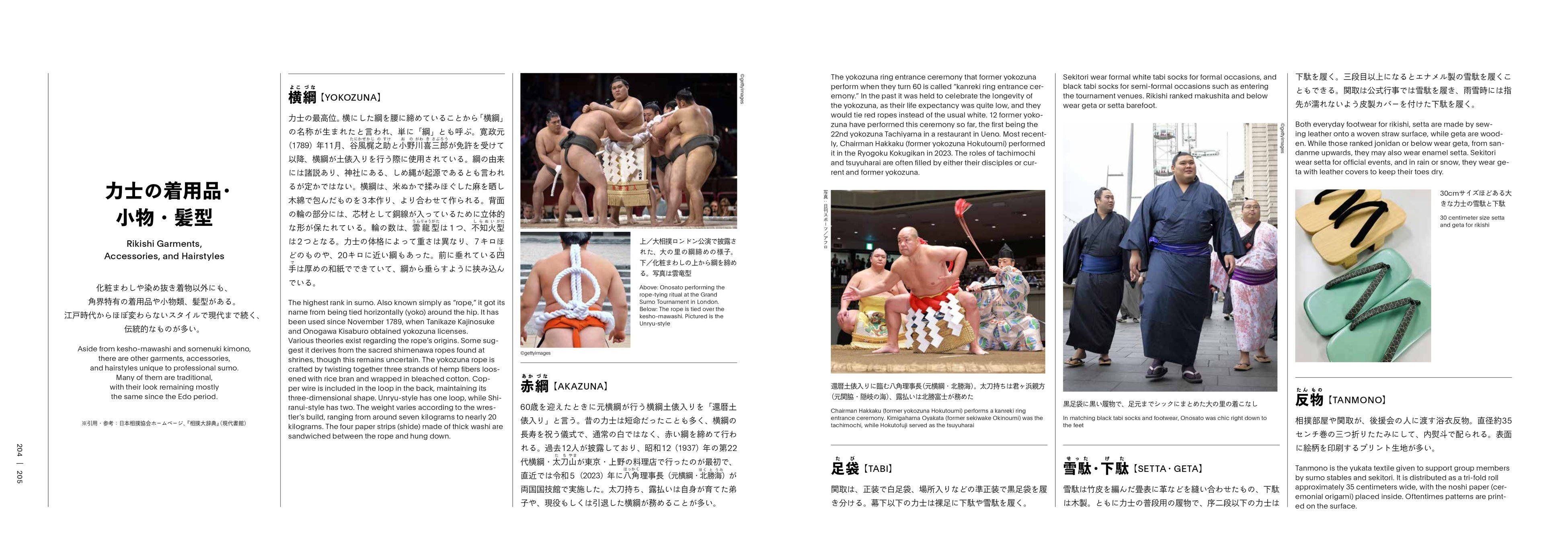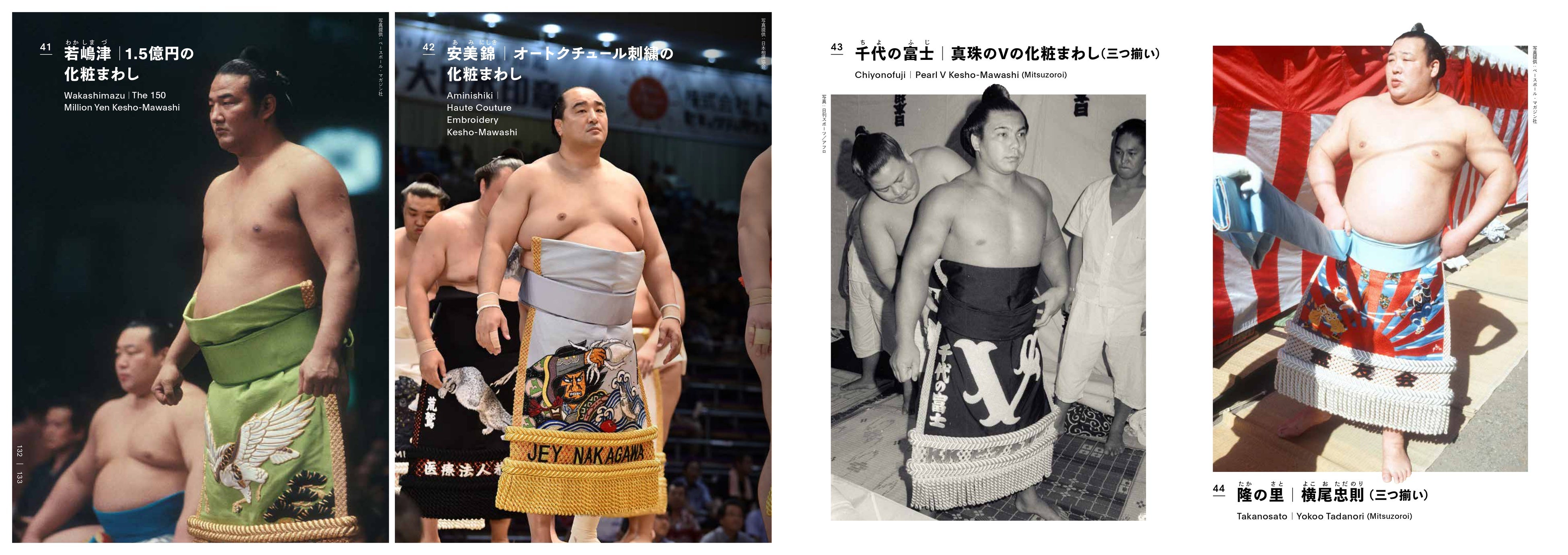 本書では、普段は見ることのできない下絵やデザイン図案、相撲博物館に所蔵されている貴重な化粧まわしや力士の着姿写真などを、すべて解説つきで紹介(日英バイリンガル表記、オールカラー208 頁)。化粧まわしの仕立て職人や着物(京友禅)の老舗、締め込みの織物工房などの製作現場にも取材撮影&収録しています。