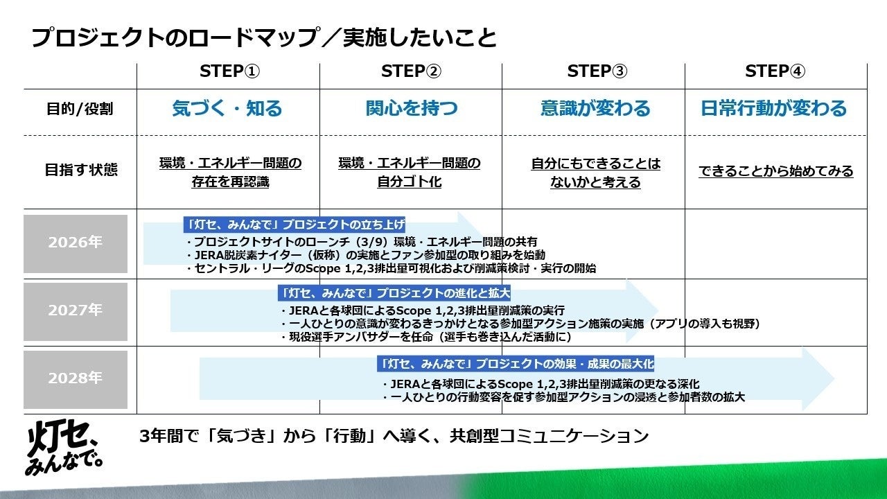 株式会社JERA(本社:東京都中央区、代表取締役会長 Global CEO:可児 行夫および代表取締役社長 CEO兼COO:奥田 久栄、以下「JERA」)とセントラル・リーグ6球団「読売ジャイアンツ」「東京ヤクルトスワローズ」「横浜DeNAベイスターズ」「中日ドラゴンズ」「阪神タイガース」「広島東洋カープ」(以下、「セ・リーグ6球団」)はこのたび、持続可能でより良い社会の実現に向けて、選手もファンも監督もみんなですすめる、JERA × セ・リーグ「灯セ、みんなで。」プロジェクトを始動することといたしました。
