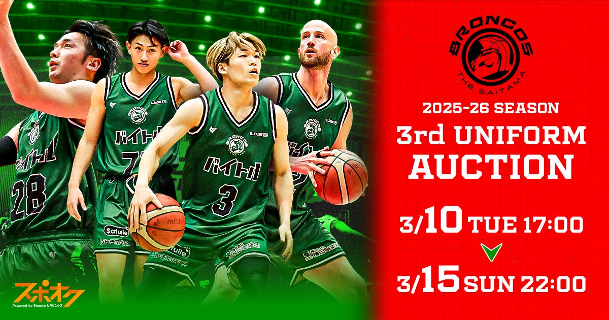株式会社モバオク(本社:東京都渋谷区、代表取締役社長:小一原 宏樹、以下モバオク)がエンゲート株式会社(本社:東京都中央区、代表取締役:城⼾ 幸⼀郎、以下エンゲート)と業務提携し提供するスポーツチーム公式オークションサービス「スポオク」にてB.LEAGUE所属のさいたまブロンコスが実施する『さいたまブロンコス 2025-26 SEASON 3rdユニフォームオークション』を2026年3月10日(火)から開始します。