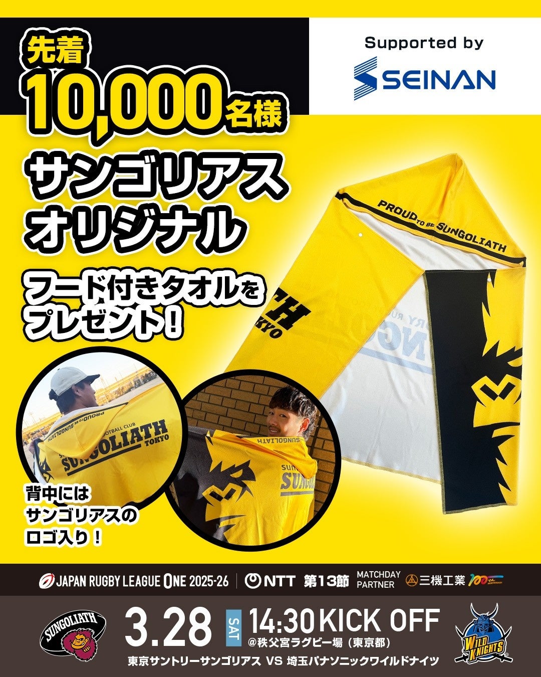 サンゴリアスのロゴがデザインされたフード付きタオルを先着10,000名様に入場ゲートにてプレゼントいたします。