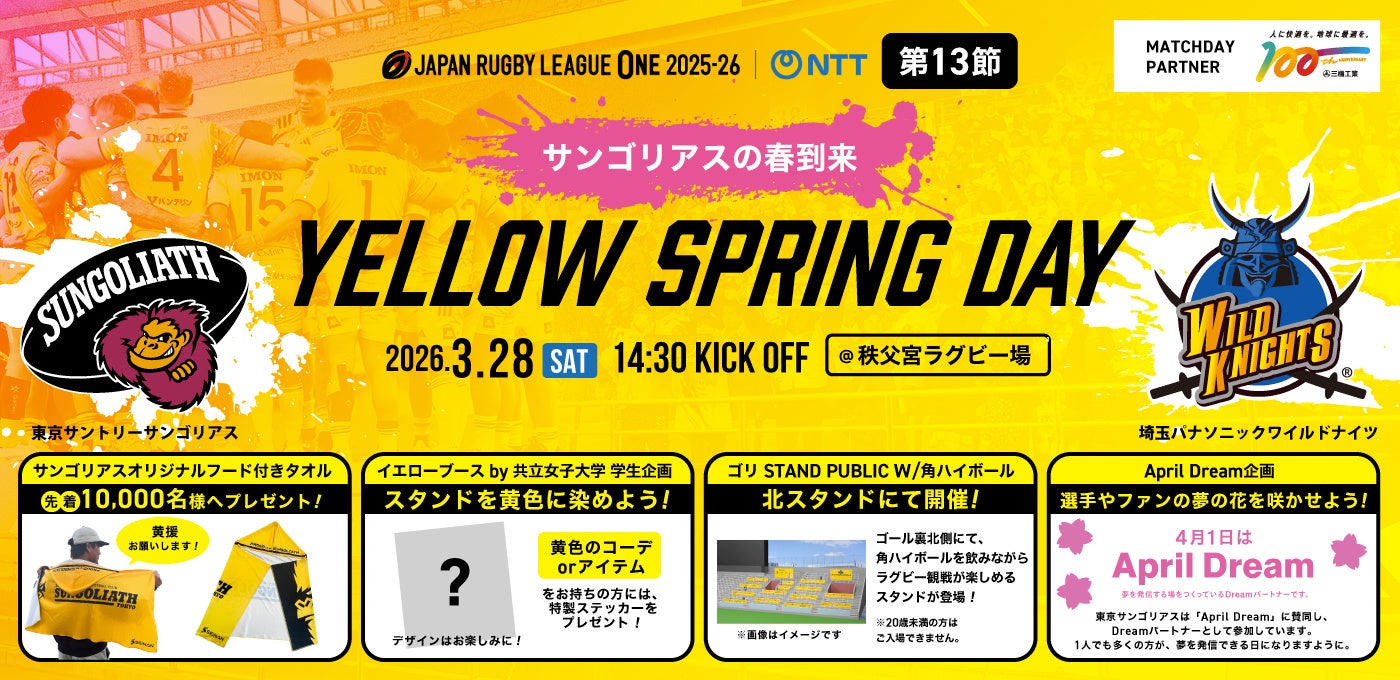 プレーオフに向けた大事な上位対決となるこの試合では、会場をチームカラーのイエローに染め選手たちを後押ししたいという想いから、「黄色で彩るサンゴリアスの春」をテーマにした「YELLOW SPRING DAY」を開催いたします。イエローのフード付きタオルの配布や「角ハイボール」とのコラボ、「イエローブース」の設置など、黄色をテーマにした企画を予定していますので、ぜひファンの皆さまも黄色を身にまとって試合会場に足をお運びください。