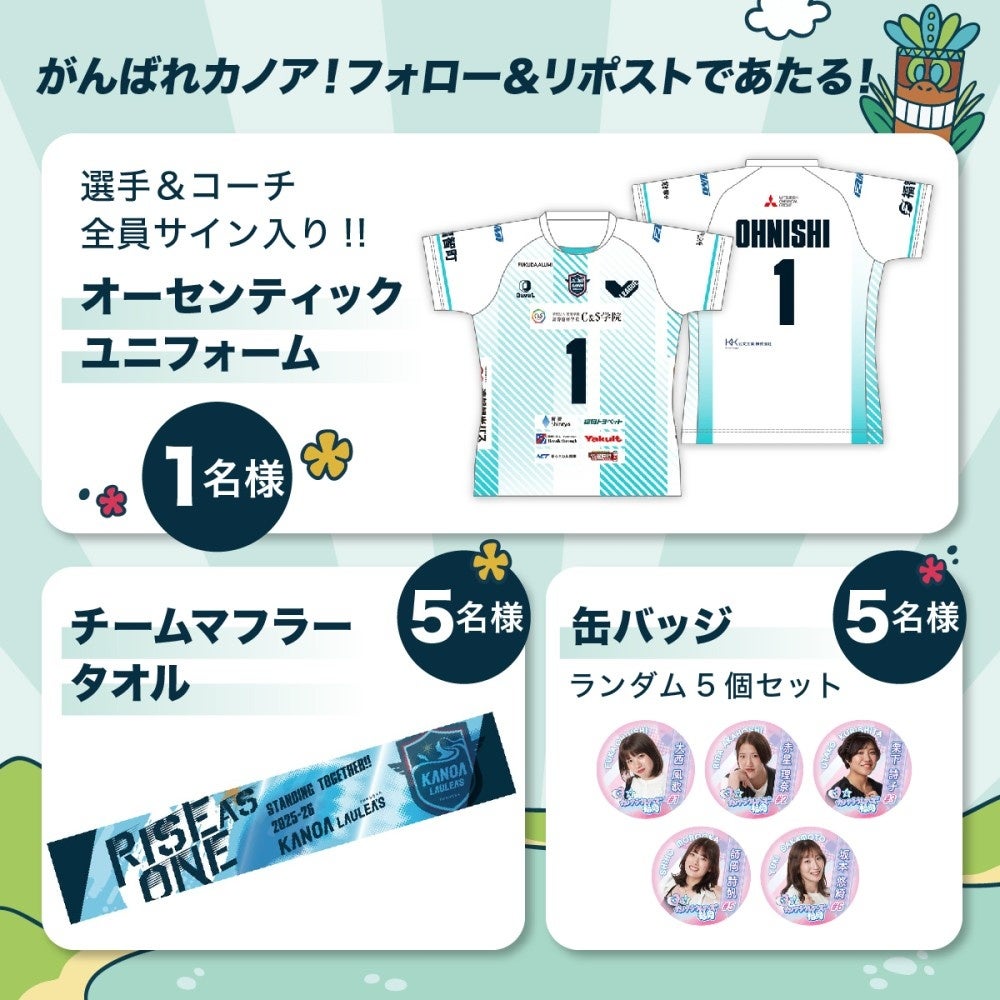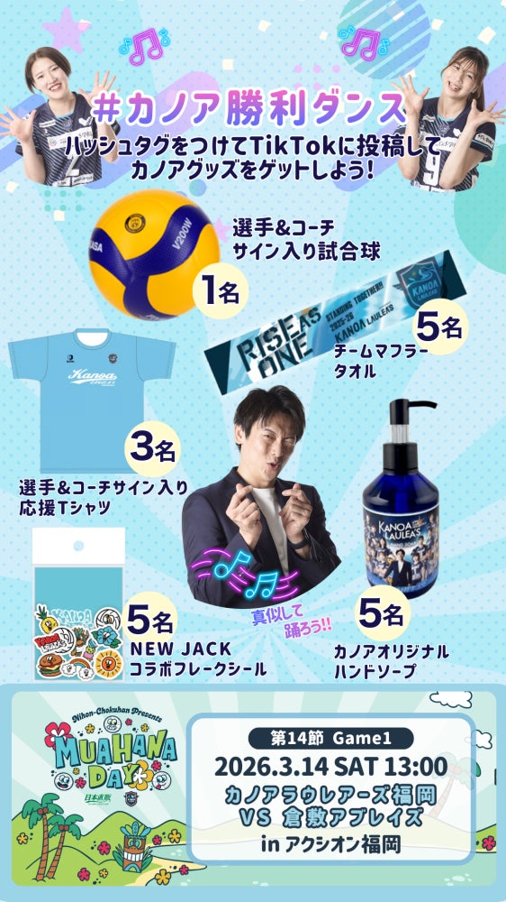 TikTokでは、カノアラウレアーズ福岡公式アカウントおよび日本直販公式アカウントで配信する「#カノア勝利ダンス」を真似して投稿した方の中から、抽選で19名にカノアグッズをプレゼントします。SNS上の参加そのものを観戦体験の入口にし、会場来場前から熱量を高めてまいります。