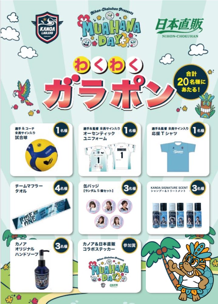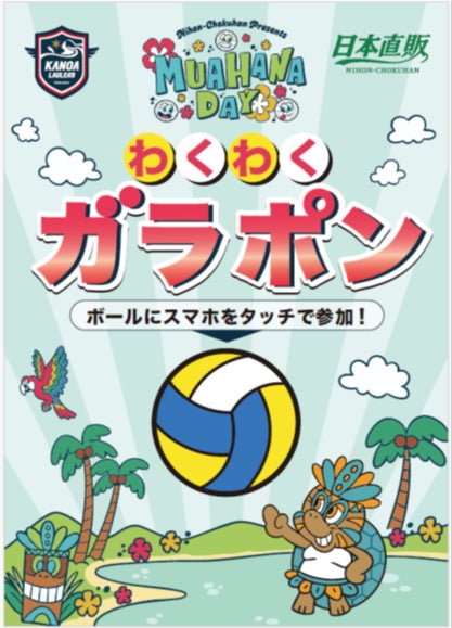 試合開始前には、日本直販ブースで無料参加型の「カノアラウレアーズ福岡 OLIOLIガラポン」を実施します。会場内に設置されたバレーボールにスマートフォンをタッチするとガラポンアプリが自動で起動し、その場で抽選結果が表示される仕組みで、抽選で20名に日本直販オリジナルグッズやカノアグッズが当たります。ハズレなしで、家族や友人と一緒に楽しめる参加型企画として展開します。