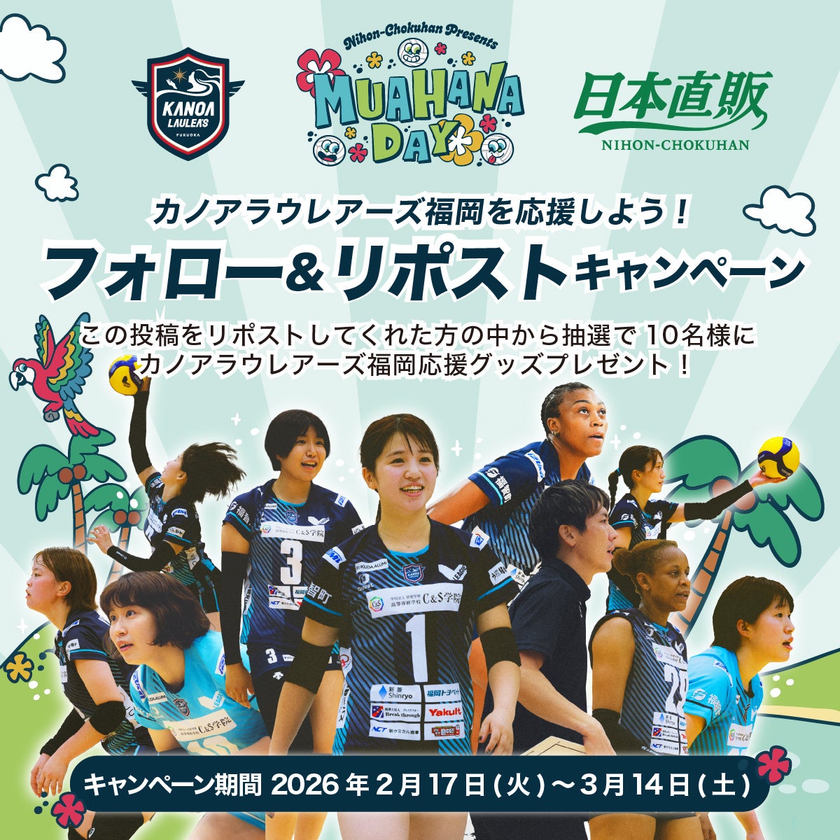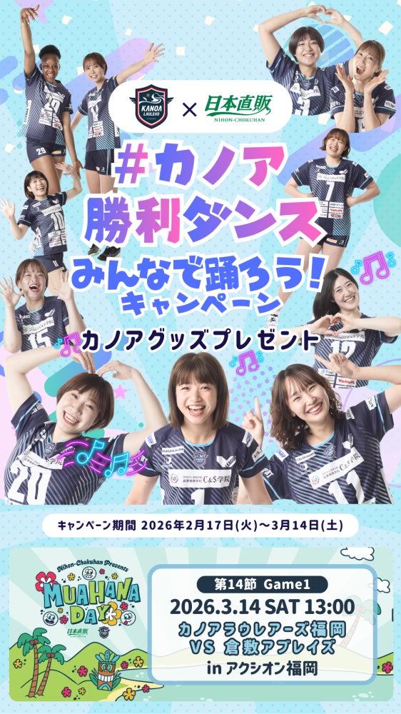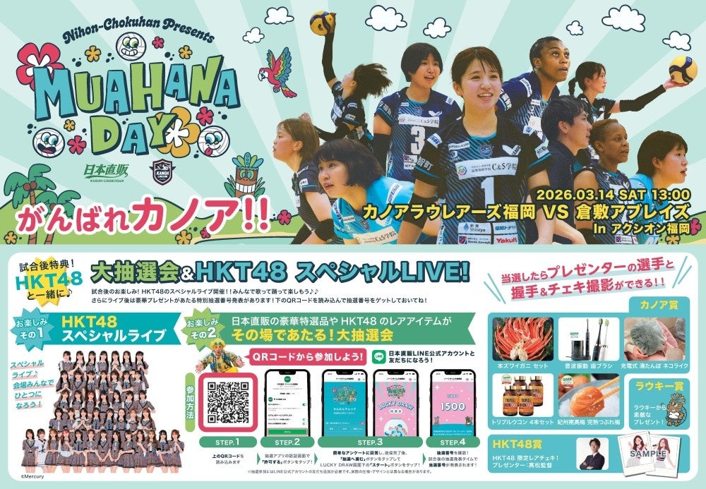 日本直販株式会社(本社:東京都港区、代表取締役社長 水谷 彰孝/以下、日本直販)は、これまでの総合通販から「エンタメ、グローバル、DX・デジタル」を軸に“総合サービス(WEB3.0)”企業へ進化する取り組みの一環として、出資先の女子プロバレーボールチーム「カノアラウレアーズ福岡」の冠試合『日本直販PRESENTS MUA HANA DAY』(2026年3月14日・アクシオン福岡)における、当日企画の詳細を公開します。日本直販は第1弾で冠試合開催、第2弾でHKT48のゲスト出演決定を発表しており、第3弾となる今回は、X・TikTok・LINE・NFC・QRを掛け合わせた“試合前・試合後まで続く観戦体験”の詳細をお知らせします。
