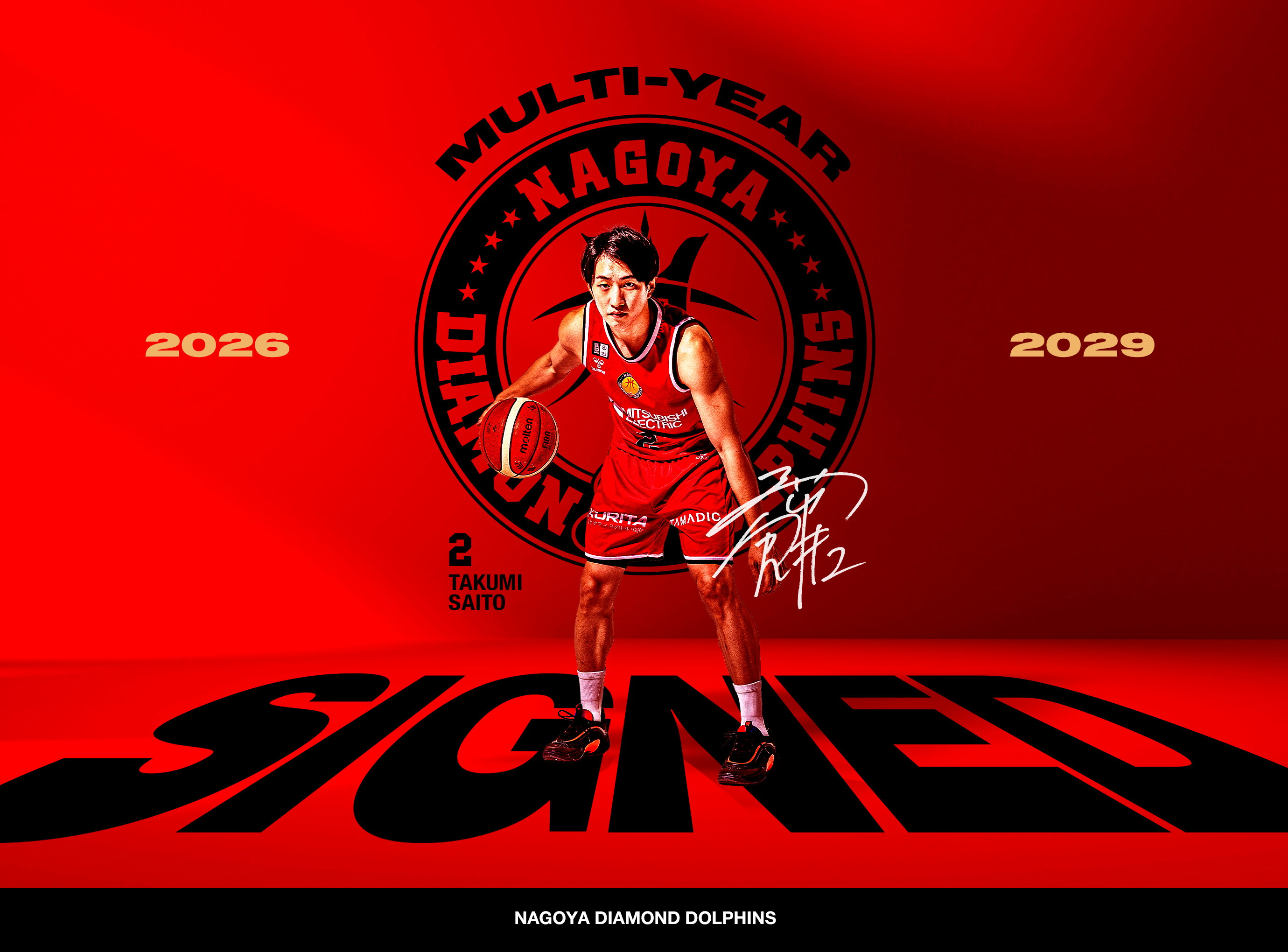 このたび名古屋ダイヤモンドドルフィンズは、齋藤拓実選手とB.LEAGUE 2026-27シーズンから2028-29シーズンまで、3年間の複数年契約が合意に至りましたのでお知らせいたします。