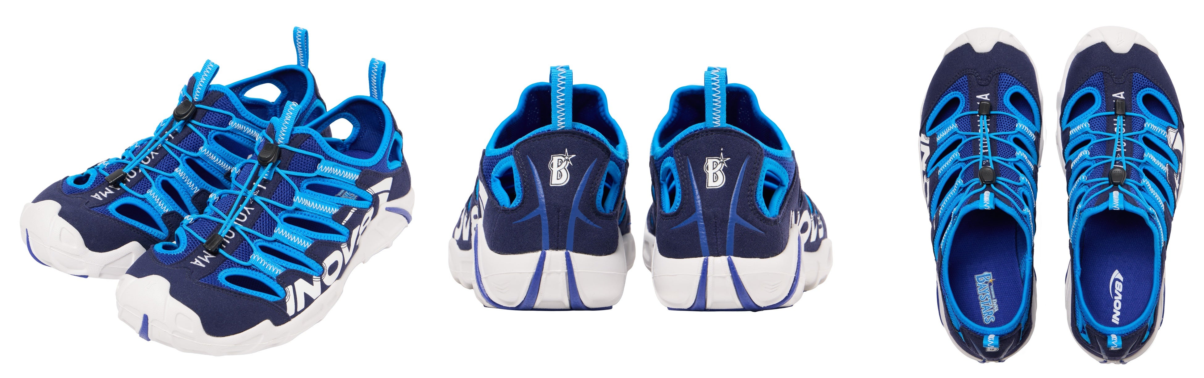 デザインは、横浜DeNAベイスターズのチームカラーである「ベイスターズブルー」をベースに、かかとにはチームのシンボルマーク、アッパー部分には「I ☆ YOKOHAMA(I LOVE YOKOHAMA)」の刺繍、インソールには『INOV8』のロゴを右足にチームロゴを左足にプリントした、ベイスターズ愛にあふれるスペシャル仕様です。