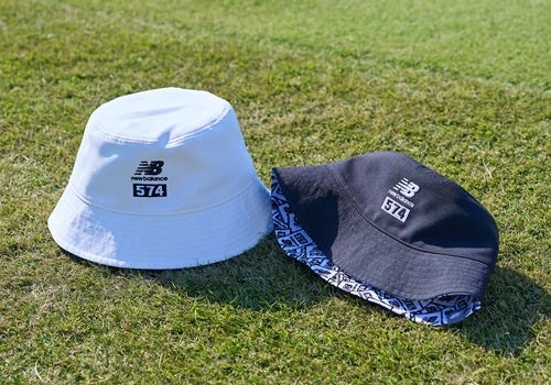 リバーシブルバケットハット。表面はシンプルな無地、裏面は574ロゴの総柄デザインで、コーディネートに合わせてそれぞれ楽しめる。