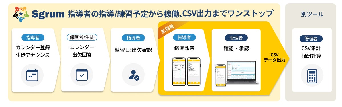 すでに多くの自治体やスポーツクラブで「連絡網」や「月謝決済」のインフラとして導入されているSgrumに、今回新たに外部指導員の管理機能が加わりました。これにより、現場の業務報告から本部の報酬管理までがシームレスに繋がります。