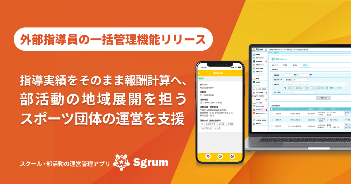 スポーツテック企業の株式会社ユーフォリア(本社:東京都千代田区、代表取締役社長:橋口 寛、以下 ユーフォリア)は、スクール・部活動運営管理アプリ「Sgrum(スグラム)」において、部活動の地域展開に伴う外部指導員の管理業務を効率化する新機能「スタッフ活動レポート機能」をリリースいたしました。