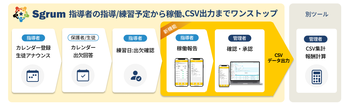 すでに多くの自治体やスポーツクラブで「連絡網」や「月謝決済」のインフラとして導入されているSgrumに、今回新たに外部指導員の管理機能が加わりました。これにより、現場の業務報告から本部の報酬管理までがシームレスに繋がります。