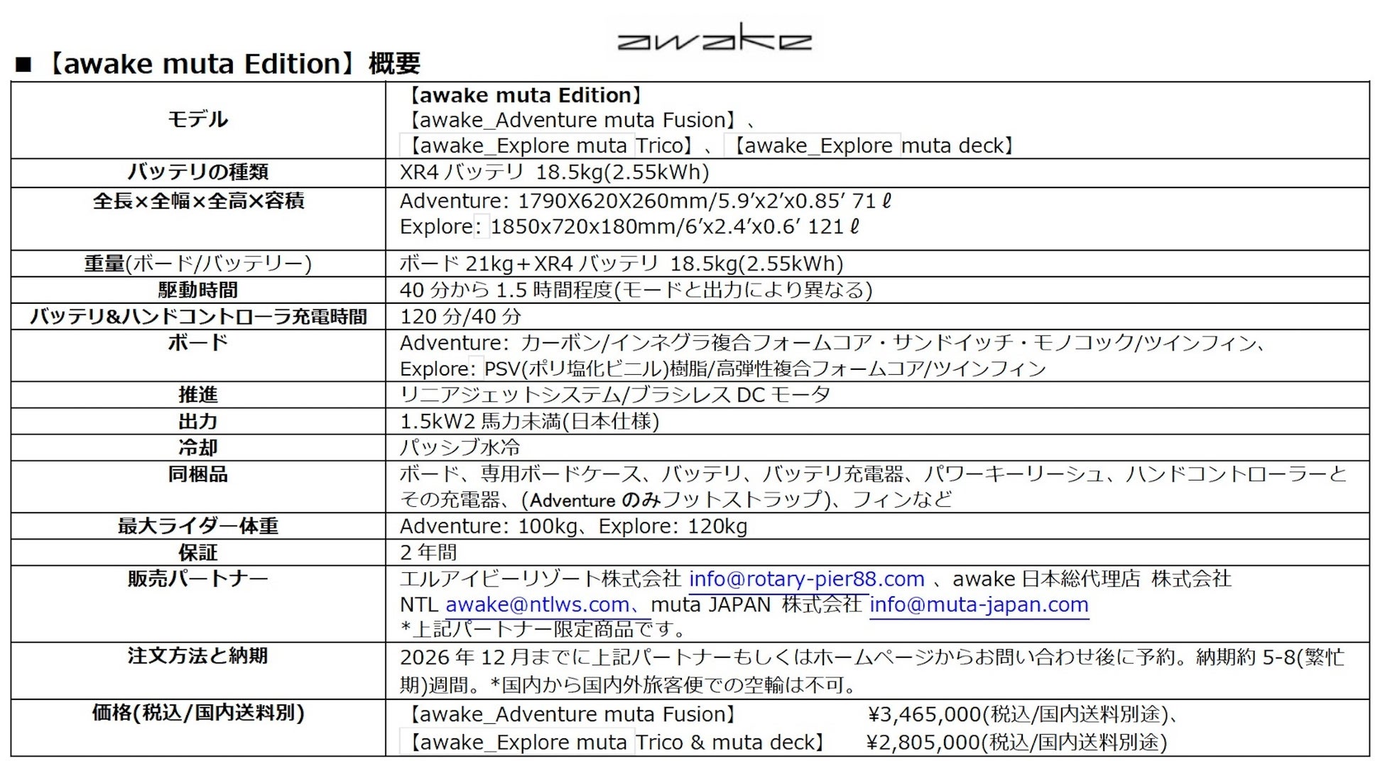 エルアイビーリゾート株式会社 info@rotary-pier88.com 、awake日本総代理店 株式会社NTL awake@ntlws.com、muta JAPAN 株式会社 info@muta-japan.com までお問合せください。